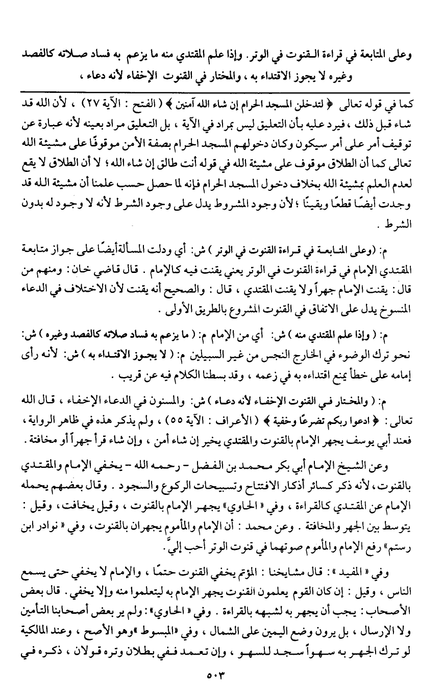 وعن الشيخ الإمام أبي بكر محمد بن الفضل - رَحِمَهُ اللَّهُ - يخفي الإمام والمقتدي بالقنوت؛ لأنه ذكر كسائر أذكار الافتتاح وتسبيحات الركوع والسجود. وقال بعضهم يحمله الإمام عن المقتدي كالقراءة، وفي " الحاوي " يجهر الإمام بالقنوت، وقيل يخافت، وقيل يتوسط بين الجهر والمخافتة. وعن محمد: أن الإمام والمأموم يجهران بالقنوت، وفي " نوادر ابن رستم " رفع الإمام والمأموم صوتهما في قنوت الوتر أحب إلي.