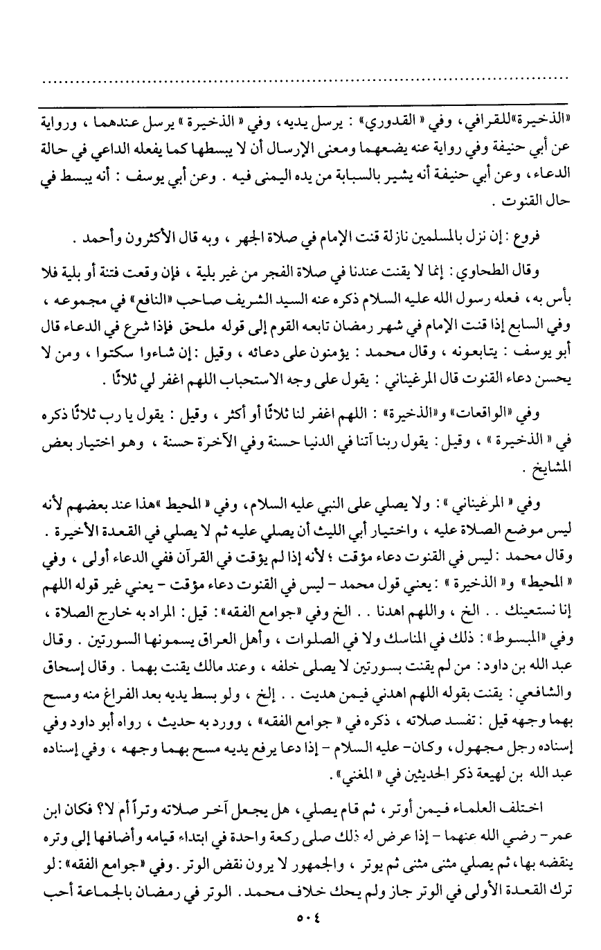 ـــــــــــــــــــــــــــــQ" الذخيرة " للقرافي، وفي " القدوري ": يرسل يديه، وفي " الذخيرة " يرسل عندهما، ورواية عن أبي حنيفة وفي رواية عنه يضعهما، ومعنى الإرسال: أن لا يبسطها كما يفعله الداعي في حالة الدعاء، وعن أبي حنيفة أنه يشير بالسبابة من يده اليمنى فيه. وعن أبي يوسف: أنه يبسط في حال القنوت.