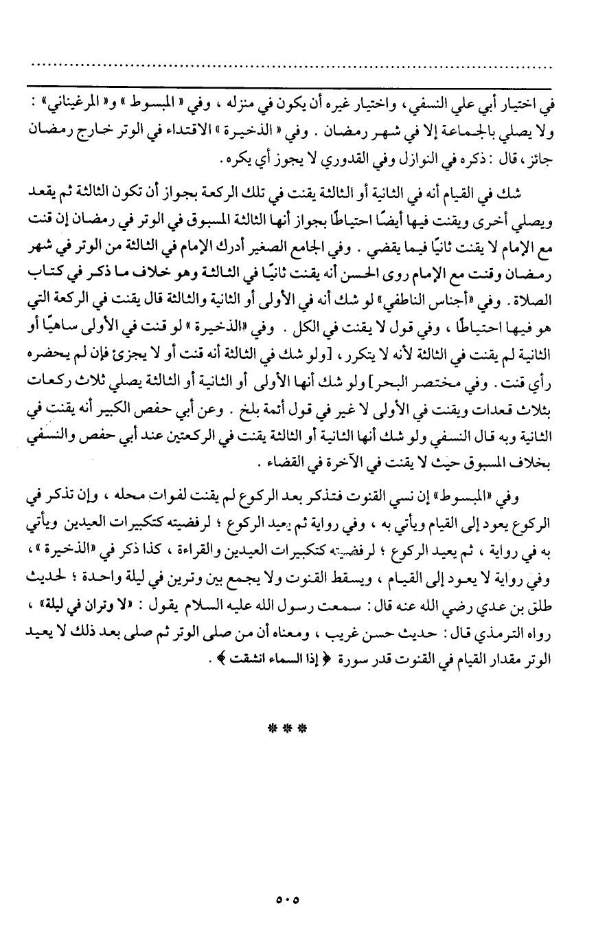 وفي " المبسوط " إن نسي القنوت فتذكر بعد الركوع لم يقنت لفوات محله، وإن تذكر في الركوع يعود إلى القيام ويأتي به، وفي رواية ثم يعيد الركوع؛ لفرضيته كتكبيرات العيدين ويأتي به في رواية، ثم يعيد الركوع؛ لفرضيته كتكبيرات العيدين والقراءة، كذا ذكر في " الذخيرة "، وفي رواية لا يعود إلى القيام، ويسقط القنوت ولا يجمع بين وترين في ليلة واحدة؛ لحديث طلق بن عدي - رَضِيَ اللَّهُ عَنْهُ - قال: سمعت رسول الله - عَلَيْهِ السَّلَامُ - يقول: «لا وتران في ليلة» ، رواه الترمذي قال: حديث حسن غريب، ومعناه أن من صلى الوتر ثم صلى بعد ذلك لا يعيد الوتر، مقدار القيام في القنوت قدر سورة {إِذَا السَّمَاءُ انْشَقَّتْ} [الانشقاق: 1] .