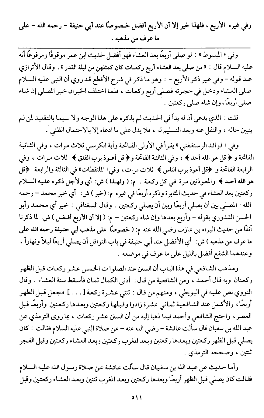 ـــــــــــــــــــــــــــــQوفي " المبسوط ": لو صلى أربعا بعد العشاء فهو أفضل لحديث ابن عمر موقوفا ومرفوعا أنه - عَلَيْهِ السَّلَامُ - قال: «من صلى بعد العشاء أربع ركعات كان كمثلهن من ليلة القدر» . وقال الأترازي عند قوله وفي غير ذكر الأربع: وهو ما ذكر في شرح الأقطع قد روي «أن النبي - عَلَيْهِ السَّلَامُ - صلى العشاء ودخل في حجرته فصلى أربع ركعات» فلما اختلف الخبران خير المصلي إن شاء صلى أربعا، وإن شاء صلى ركعتين.
