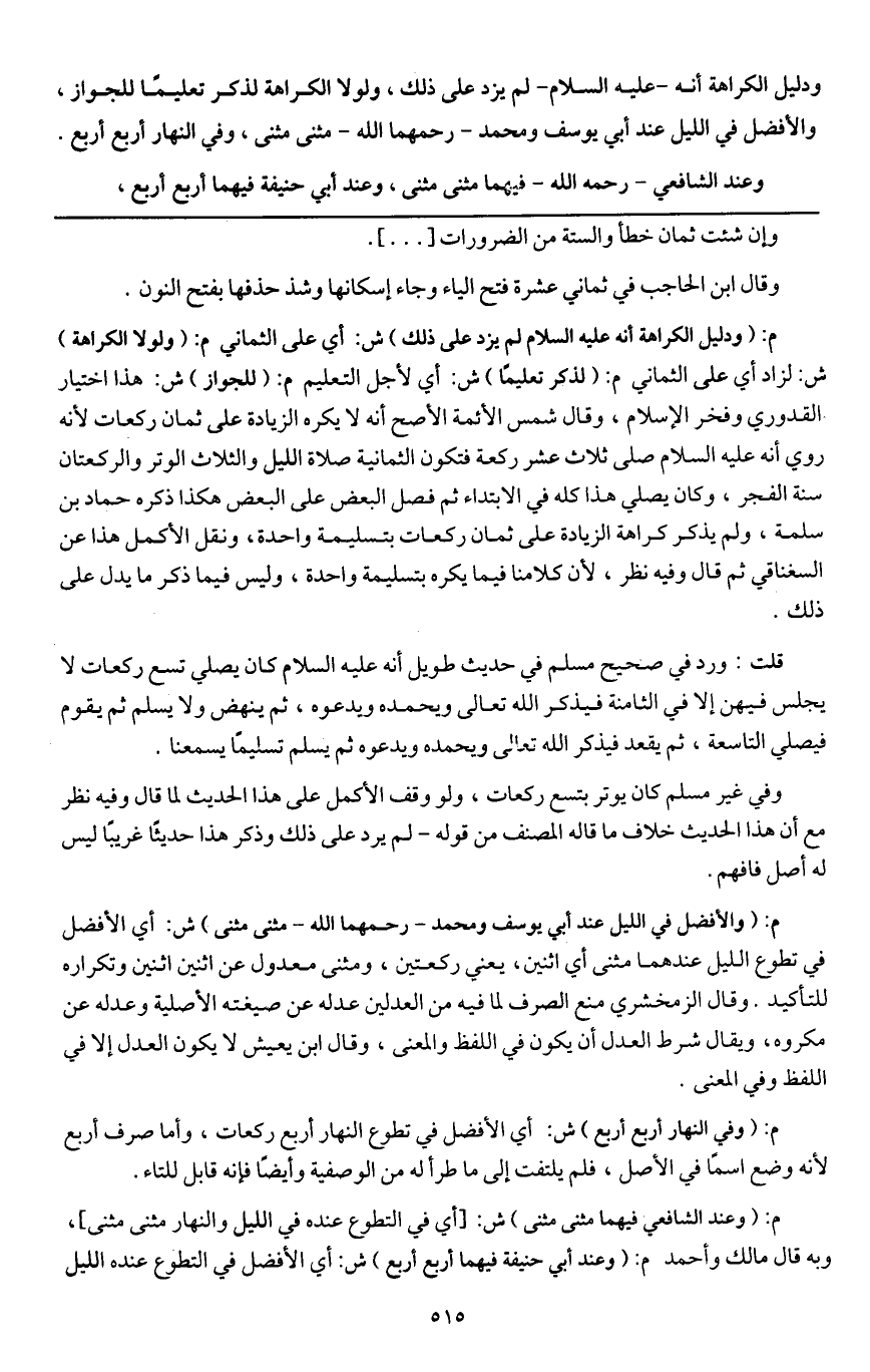 قلت: ورد في صحيح مسلم في حديث طويل «أنه - عَلَيْهِ السَّلَامُ - كان يصلي تسع ركعات لا يجلس فيهن إلا في الثامنة فيذكر الله تعالى ويحمده ويدعوه، ثم ينهض ولا يسلم ثم يقوم فيصلي التاسعة، ثم يقعد فيذكر الله تعالى ويحمده ويدعوه ثم يسلم تسليما يسمعنا» .