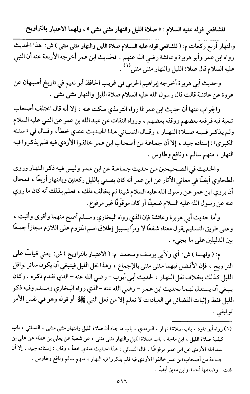 ـــــــــــــــــــــــــــــQوالنهار أربع ركعات م: (للشافعي قوله - عَلَيْهِ السَّلَامُ - صلاة الليل والنهار مثنى مثنى) ش: هذا الحديث رواه ابن عمر وأبو هريرة وعائشة - رَضِيَ اللَّهُ عَنْهَا - فحديث ابن عمر أخرجه الأربعة عنه أن النبي - عَلَيْهِ السَّلَامُ - قال «صلاة الليل والنهار مثنى مثنى» .