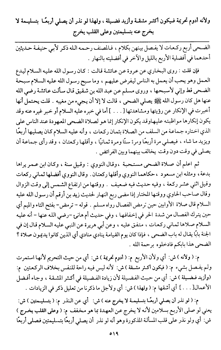 ـــــــــــــــــــــــــــــQالضحى أربع ركعات لا يفصل بينهن كلام» فالمصنف - رَحِمَهُ اللَّهُ - ذكر لأبي حنيفة حديثين أحدهما في أفضلية الأربع بالليل والآخر في أفضليته بالنهار.