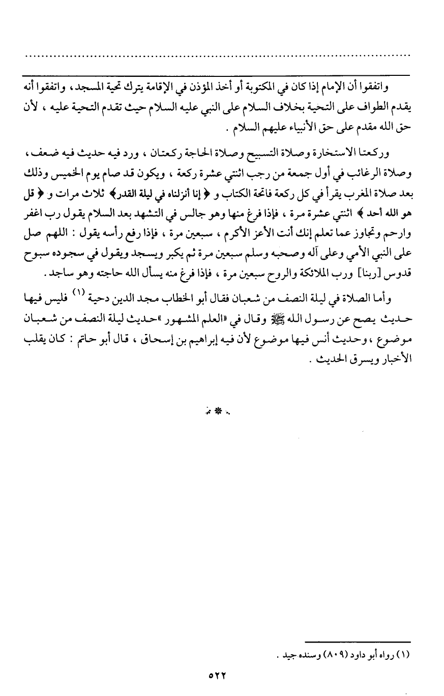 وأما الصلاة في ليلة النصف من شعبان فقال أبو الخطاب مجد الدين دحية فليس فيها حديث يصح عن رسول الله - صَلَّى اللَّهُ عَلَيْهِ وَسَلَّمَ - وقال في " العلم المشهور " حديث ليلة النصف من شعبان موضوع، وحديث أنس فيها موضوع لأن فيه إبراهيم بن إسحاق، قال أبو حاتم: كان يقلب الأخبار ويسرق الحديث.