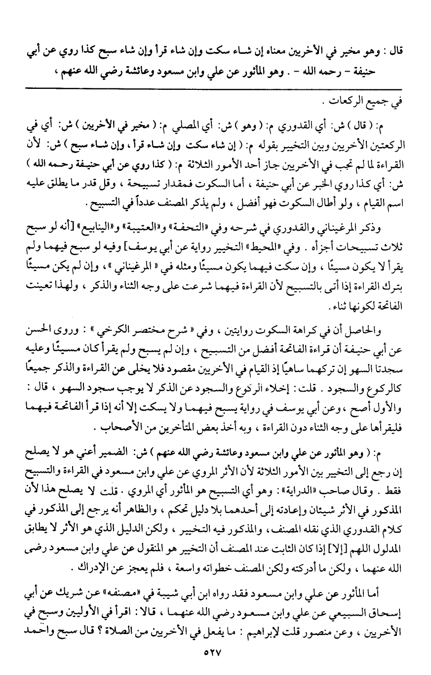قال: وهو مخير في الأخريين معناه إن شاء سكت وإن شاء قرأ وإن شاء سبح كذا روي عن أبي حنيفة - رَحِمَهُ اللَّهُ -. وهو المأثور عن علي وابن مسعود وعائشة - رَضِيَ اللَّهُ عَنْهُمْ -.