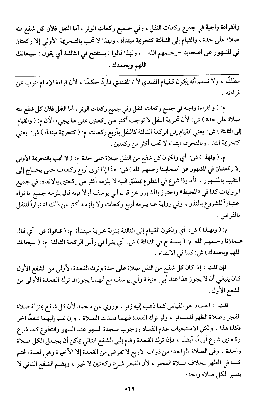 والقراءة واجبة في جميع ركعات النفل، وفي جميع ركعات الوتر، أما النفل فلأن كل شفع منه صلاة على حدة، والقيام إلى الثالثة كتحريمة مبتدأة، ولهذا لا تجب بالتحريمة الأولى إلا ركعتان في المشهور عن أصحابنا - رَحِمَهُمُ اللَّهُ - ولهذا قالوا: يستفتح في الثالثة أي يقول: سبحانك اللهم وبحمدك،