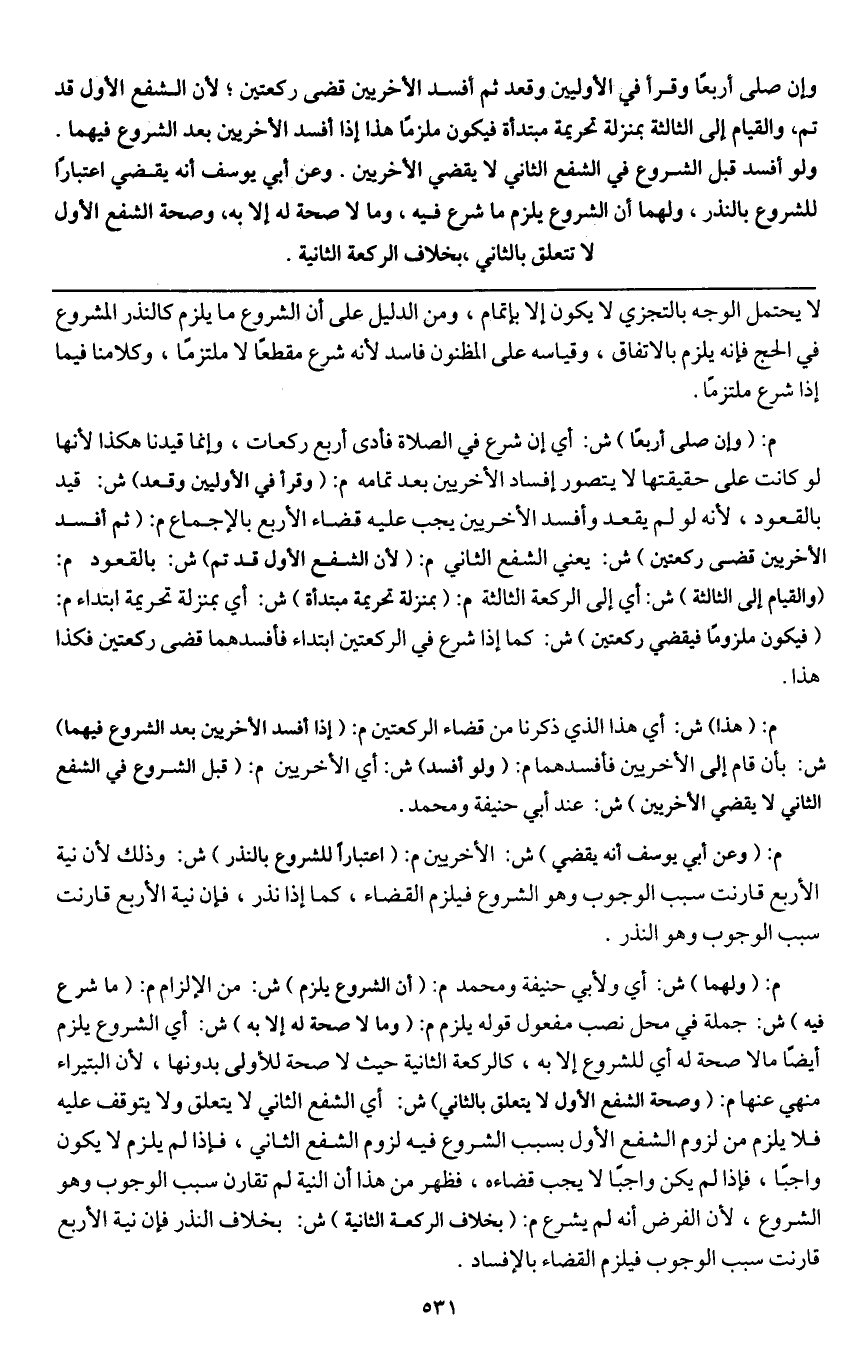 ـــــــــــــــــــــــــــــQلا يحتمل الوجه بالتجزي لا يكون إلا بإتمام، ومن الدليل على أن الشروع ما يلزم كالنذر المشروع في الحج فإنه يلزم بالاتفاق، وقياسه على المظنون فاسد لأنه شرع مقطعا لا ملتزما، وكلامنا فيما إذا شرع ملتزما.