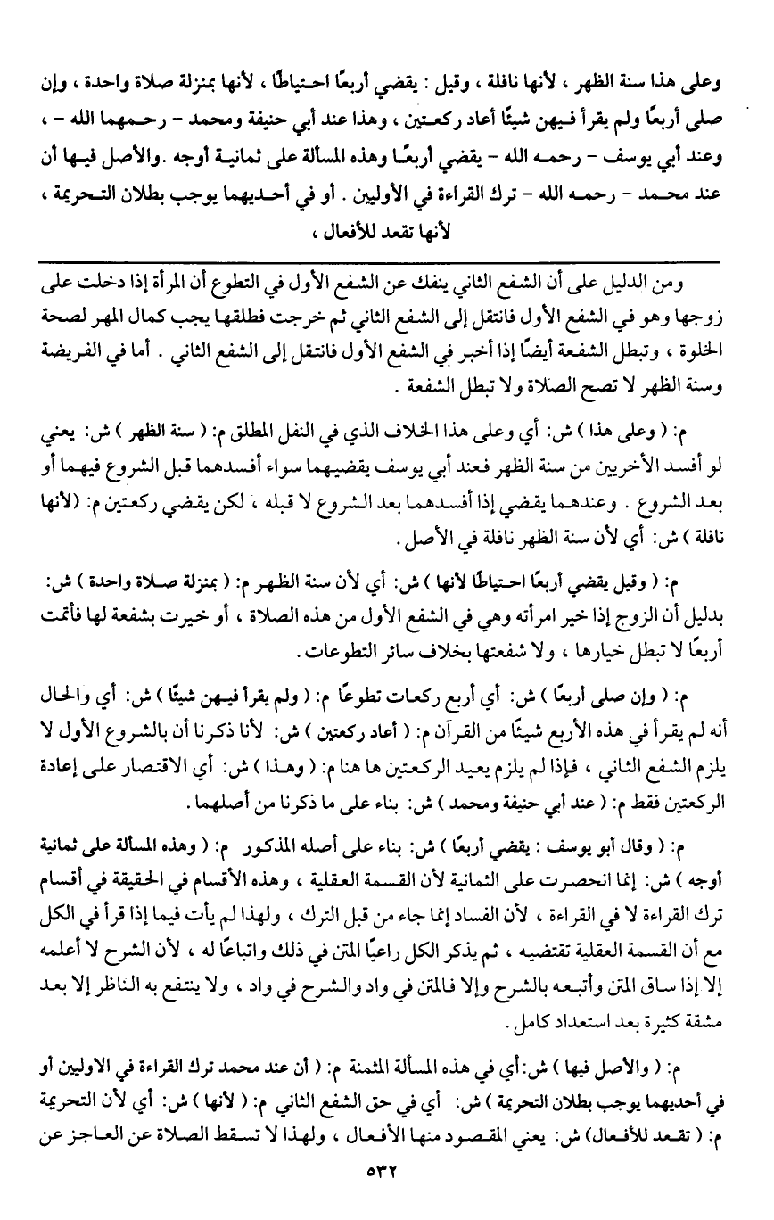 ـــــــــــــــــــــــــــــQومن الدليل على أن الشفع الثاني ينفك عن الشفع الأول في التطوع أن المرأة إذا دخلت على زوجها وهو في الشفع الأول فانتقل إلى الشفع الثاني ثم خرجت فطلقها يجب كمال المهر لصحة الخلوة، وتبطل الشفعة أيضا إذا أخبر في الشفع الأول فانتقل إلى الشفع الثاني. أما في الفريضة وسنة الظهر لا تصح الصلاة ولا تبطل الشفعة.