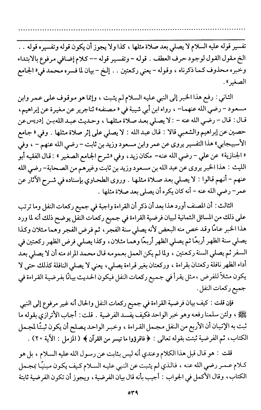 الثالث: أن المصنف أورد هذا بعد أن ذكر أن القراءة واجبة في جميع ركعات النفل وما ترتب على ذلك من المسائل الثمانية لبيان فرضية القراءة في جميع ركعات النفل يوضح ذلك أنه لما ورد هذا الخبر عاما وقد خص منه البعض لأنه يصلي سنة الفجر، ثم فرض الفجر وهما مثلان وكذا يصلي سنة الظهر أربعا ثم يصلي الظهر أربعا وهما مثلان، وكذا يصلي فرض الظهر ركعتين في السفر ثم يصلي السنة ركعتين، ولما لم يكن العمل بعمومه قال محمد المراد منه أن لا يصلي بعد أداء الظهر نافلة ركعتان بقراءة، وركعتان بغير قراءة يصلي، يعني لا يصلي النافلة كذلك حتى لا يكون مثلا للفرض، مثل يقرأ في جميع ركعات النفل فيكون الحديث بيانا بفرضية القراءة في جميع ركعات النفل.