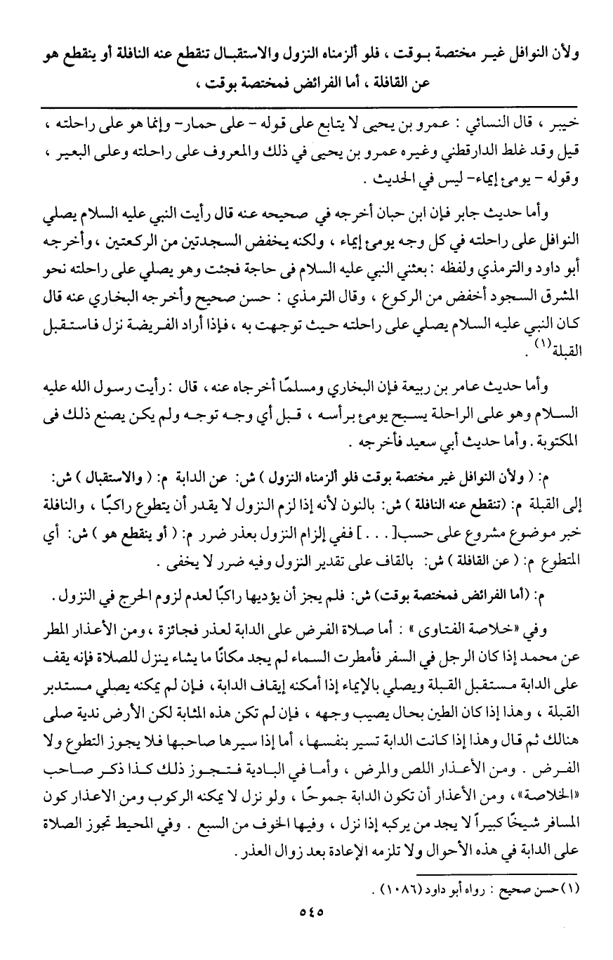 ولأن النوافل غير مختصة بوقت، فلو ألزمناه النزول والاستقبال تنقطع عنه النافلة أو ينقطع هو عن القافلة،