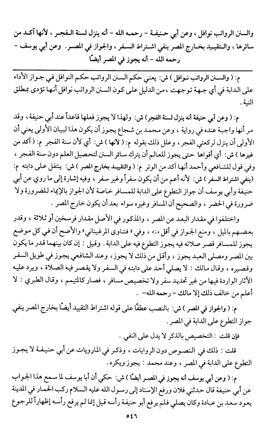 والسنن الرواتب نوافل، وعن أبي حنيفة - رَحِمَهُ اللَّهُ - أنه ينزل لسنة الفجر، لأنها آكد من سائرها، والتقييد بخارج المصر ينفي اشتراط السفر، والجواز في المصر. وعن أبي يوسف - رَحِمَهُ اللَّهُ - أنه يجوز في المصر أيضا