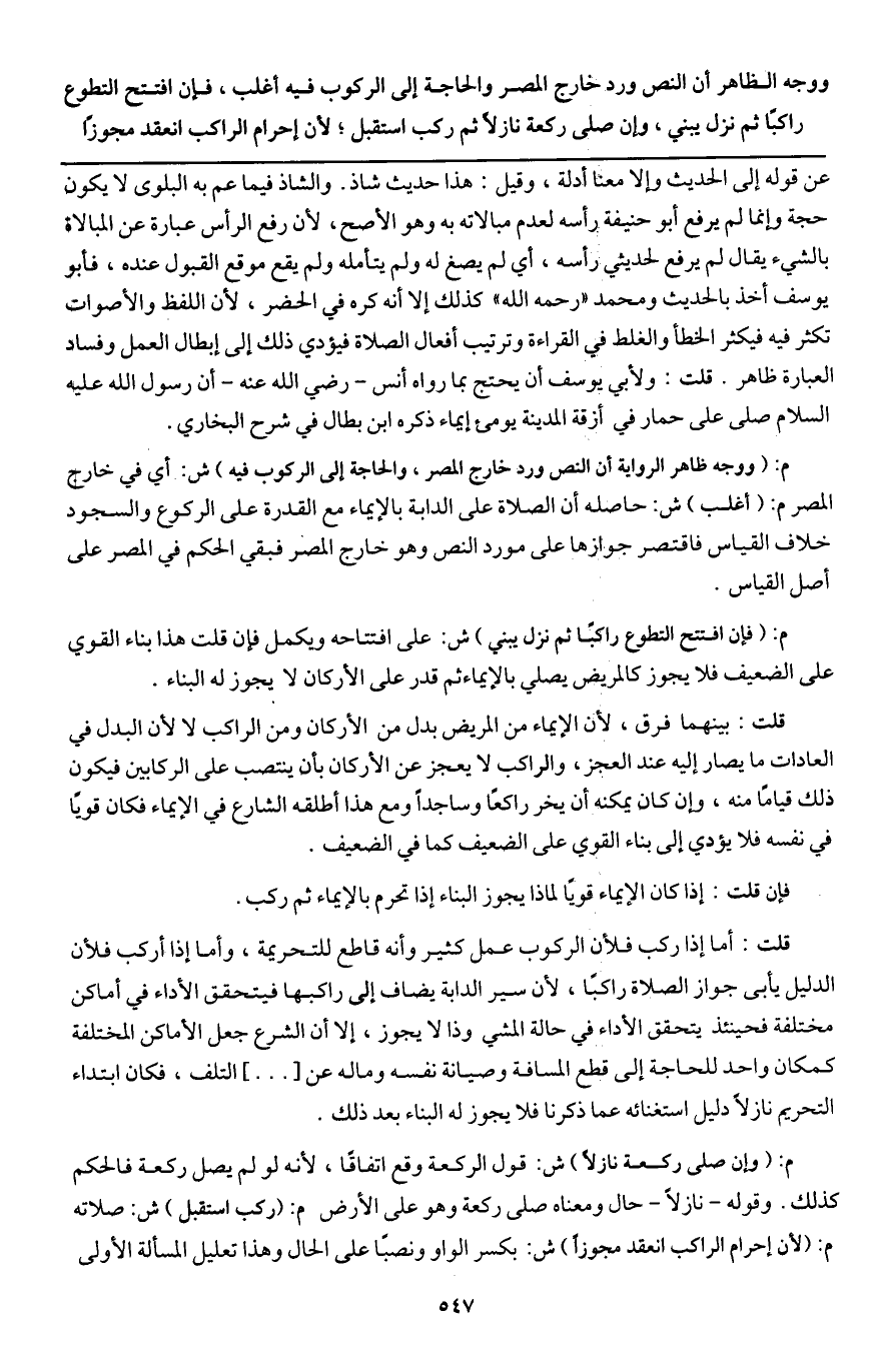 م: (ووجه ظاهر الرواية أن النص ورد خارج المصرِ، والحاجة إلى الركوب فيه) ش: أي في خارج المصر م: (أغلب) ش: حاصله أن الصلاة على الدابة بالإيماء مع القدرة على الركوع والسجود خلاف القياس فاقتصر جوازها على مورد النص وهو خارج المصر فبقي الحكم في المصر على أصل القياس.