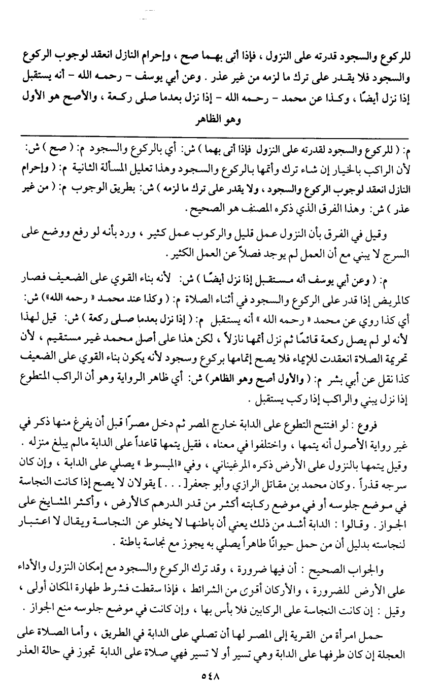 فروع: لو افتتح التطوع على الدابة خارج المصر ثم دخل مصرا قبل أن يفرغ منها ذكر في غير رواية الأصول أنه يتمها، واختلفوا في معناه، فقيل يتمها قاعدا على الدابة ما لم يبلغ منزله. وقيل يتمها بالنزول على الأرض ذكره المرغيناني، وفي " المبسوط " يصلي على الدابة، وإن كان سرجه قذرا. وكان محمد بن مقاتل الرازي وأبو جعفر [.....] يقولان لا يصح إذا كانت النجاسة في موضع جلوسه أو في موضع ركابته أكثر من قدر الدرهم كالأرض، وأكثر المشايخ على الجواز. وقالوا: الدابة أشد من ذلك يعني أن باطنها لا يخلو عن النجاسة ويقال لا اعتبار لنجاسته بدليل أن من حمل حيوانا طاهرا يصلي به يجوز مع نجاسة باطنه.
