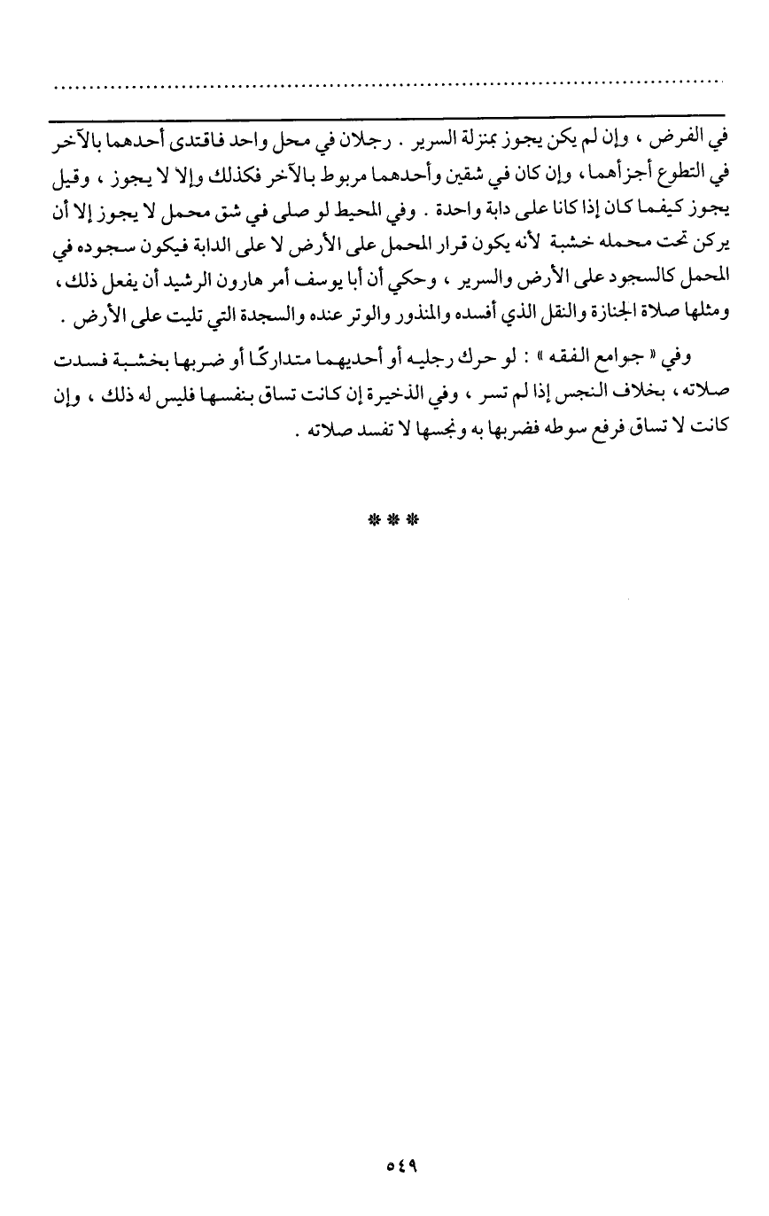 ـــــــــــــــــــــــــــــQفي الفرض، وإن لم يكن يجوز بمنزلة السرير. رجلان في محل واحد فاقتدى أحدهما بالآخر في التطوع أجزأهما، وإن كان في شقين وأحدهما مربوط بالآخر فكذلك وإلا لا يجوز، وقيل يجوز كيفما كان إذا كانا على دابة واحدة. وفي المحيط لو صلى في شق محمل لا يجوز إلا أن يركن تحت محمله خشبة لأنه يكون قرار المحمل على الأرض لا على الدابة فيكون سجوده في المحمل كالسجود على الأرض والسرير، وحكي أن أبا يوسف أمر هارون الرشيد أن يفعل ذلك، ومثلها صلاة الجنازة والنقل الذي أفسده والمنذور والوتر عنده والسجدة التي تليت على الأرض.