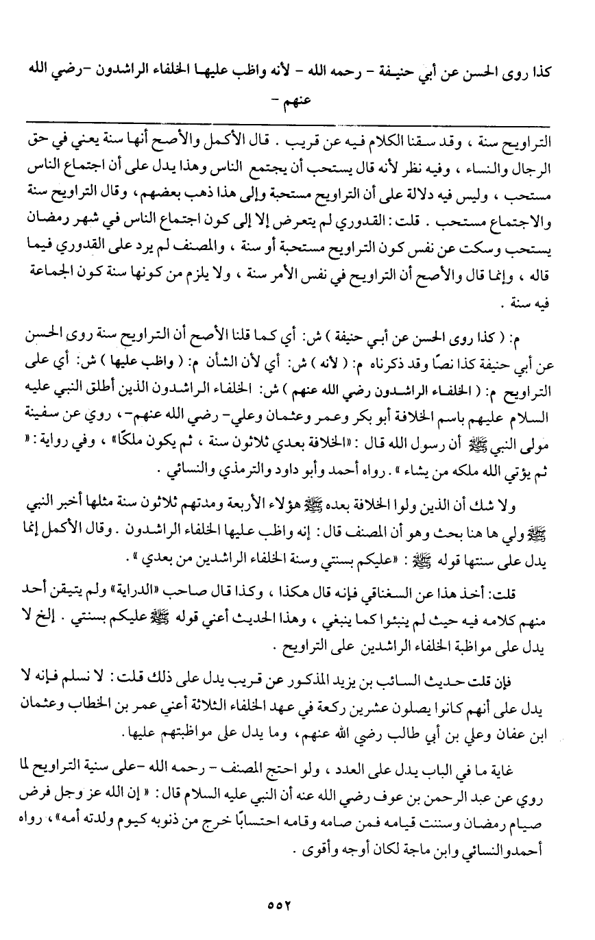 م: (كذا روى الحسن عن أبي حنيفة) ش: أي كما قلنا الأصح أن التراويح سنة روى الحسن عن أبي حنيفة كذا نصا وقد ذكرناه م: (لأنه) ش: أي لأن الشان م: (واظب عليها) ش: أي على التراويح م: (الخلفاء الراشدون - رَضِيَ اللَّهُ عَنْهُمْ -) ش: الخلفاء الراشدون الذين أطلق النبي - عَلَيْهِ السَّلَامُ - عليهم باسم الخلافة أبو بكر وعمر وعثمان وعلي - رَضِيَ اللَّهُ عَنْهُمْ -، روي عن سفينة مولى النبي - صَلَّى اللَّهُ عَلَيْهِ وَسَلَّمَ - أن رسول الله قال: «الخلافة بعدي ثلاثون سنة، ثم يكون ملكا» ، وفي رواية: «ثم يؤتي الله ملكه من يشاء» . رواه أحمد وأبو داود والترمذي والنسائي.