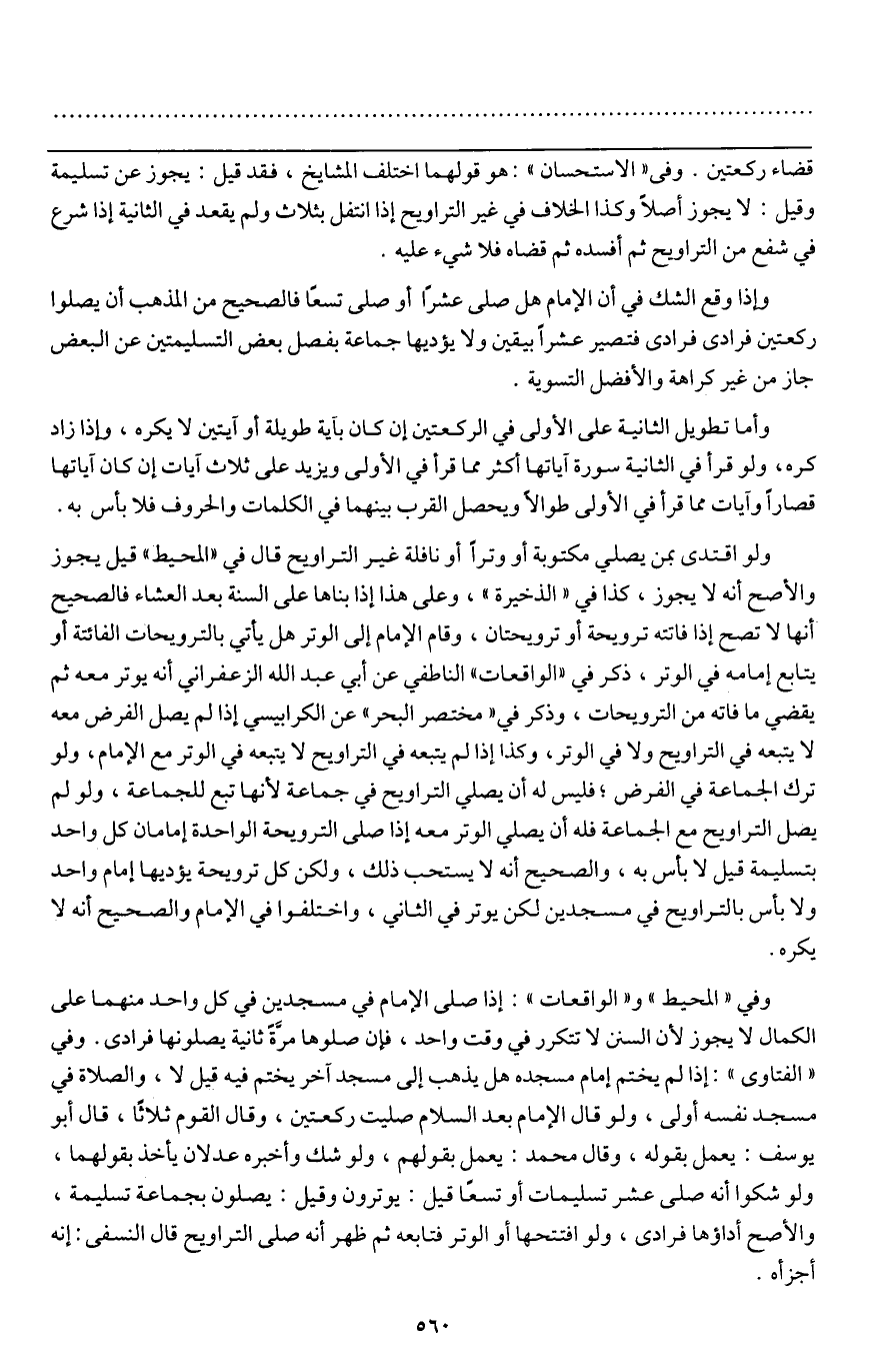 ـــــــــــــــــــــــــــــQقضاء ركعتين. وفي " الاستحسان ": هو قولهما اختلف المشايخ، فقد قيل: يجوز عن تسليمة وقيل: لا يجوز أصلا وكذا الخلاف في غير التراويح إذا انتفل بثلاث ولم يقعد في الثانية إذا شرع في شفع من التراويح ثم أفسده ثم قضاه فلا شيء عليه.