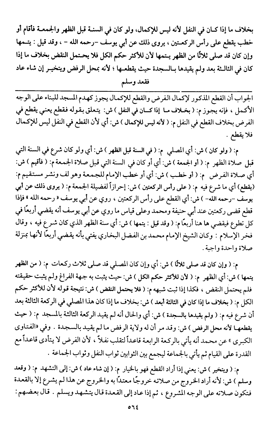 لأنه ليس للإكمال، ولو كان في السنة قبل الظهر والجمعة فأقام أو خطب يقطع على رأس الركعتين، يروى ذلك عن أبي يوسف - رَحِمَهُ اللَّهُ -، وقد قيل: يتمها وإن كان قد صلى ثلاثا من الظهر يتمها لأن للأكثر حكم الكل فلا يحتمل النقض بخلاف ما إذا كان في الثالثة بعد ولم يقيدها بالسجدة حيث يقطعها؛ لأنه بمحل الرفض ويتخير إن شاء عاد فقعد وسلم