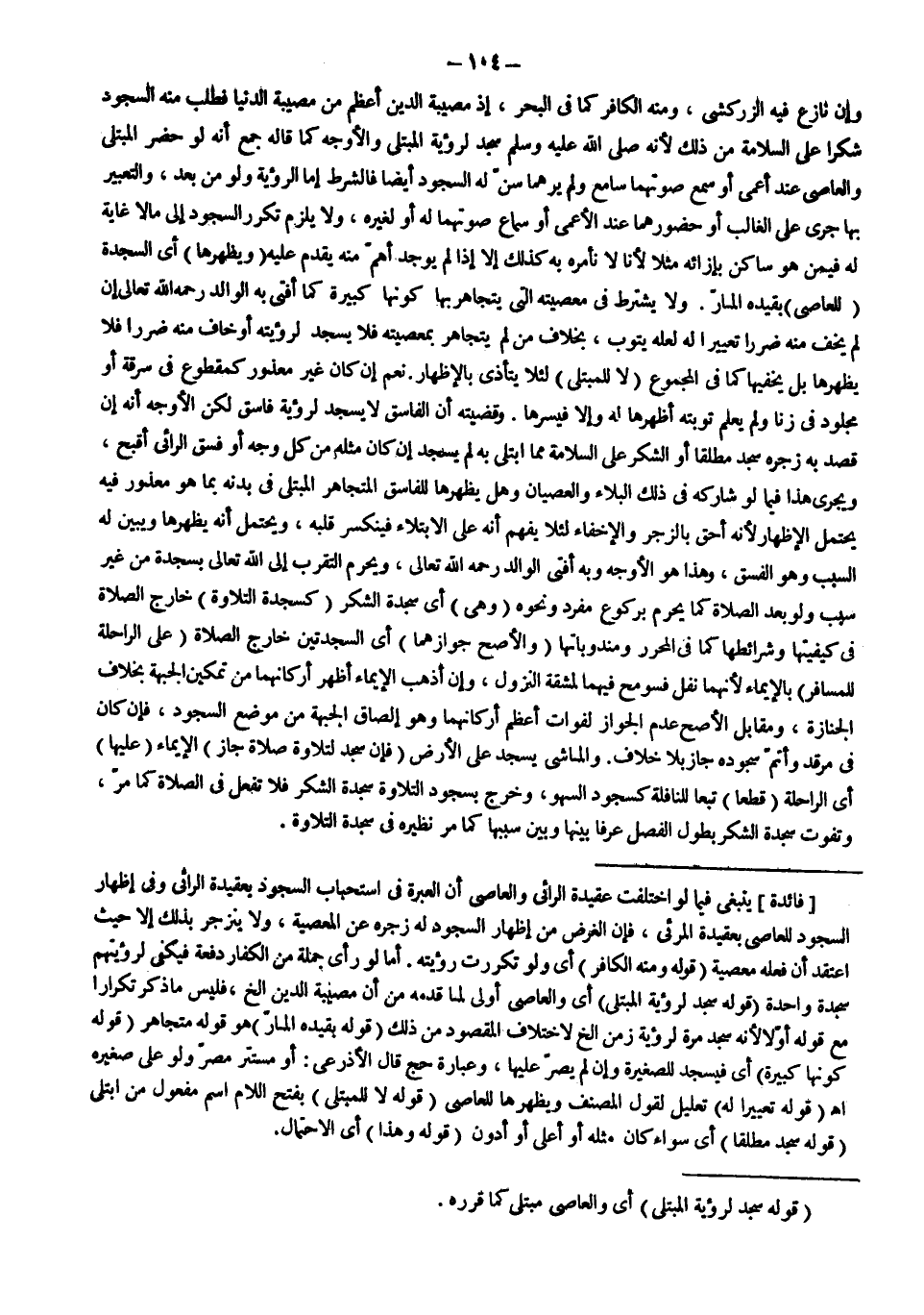 وَقَضِيَّتُهُ أَنَّ الْفَاسِقَ لَا يَسْجُدُ لِرُؤْيَةِ فَاسِقٍ لَكِنَّ الْأَوْجَهَ أَنَّهُ إنْ قَصَدَ بِهِ زَجْرَهُ سَجَدَ مُطْلَقًا أَوْ الشُّكْرِ عَلَى السَّلَامَةِ مِمَّا اُبْتُلِيَ بِهِ لَمْ يَسْجُدْ إنْ كَانَ مِثْلُهُ مِنْ كُلِّ وَجْهٍ أَوْ فِسْقُ الرَّائِي أَقْبَحَ وَيَجْرِي هَذَا فِيمَا لَوْ شَارَكَهُ فِي ذَلِكَ الْبَلَاءِ وَالْعِصْيَانِ وَهَلْ يُظْهِرُهَا لِلْفَاسِقِ الْمُتَجَاهِرِ الْمُبْتَلَى فِي بَدَنِهِ بِمَا هُوَ مَعْذُورٌ فِيهِ يُحْتَمَلُ الْإِظْهَارَ؛ لِأَنَّهُ أَحَقُّ بِالزَّجْرِ وَالْإِخْفَاءِ لِئَلَّا يَفْهَمَ أَنَّهُ عَلَى الِابْتِلَاءِ فَيَنْكَسِرَ قَلْبُهُ، وَيُحْتَمَلُ أَنَّهُ يُظْهِرُهَا وَيُبَيِّنُ لَهُ السَّبَبَ وَهُوَ الْفِسْقُ، وَهَذَا هُوَ الْأَوْجَهُ وَبِهِ أَفْتَى الْوَالِدُ - رَحِمَهُ اللَّهُ تَعَالَى -. وَيَحْرُمُ التَّقَرُّبُ إلَى اللَّهِ تَعَالَى بِسَجْدَةٍ مِنْ غَيْرِ سَبَبٍ وَلَوْ بَعْدَ الصَّلَاةِ كَمَا يَحْرُمُ بِرُكُوعٍ مُفْرَدٍ وَنَحْوِهِ (وَهِيَ) أَيْ سَجْدَةُ الشُّكْرِ (كَسَجْدَةِ التِّلَاوَةِ) خَارِجَ الصَّلَاةِ فِي كَيْفِيَّتِهَا وَشَرَائِطِهَا كَمَا فِي الْمُحَرَّرِ وَمَنْدُوبَاتِهَا (وَالْأَصَحُّ جَوَازُهُمَا) أَيْ السَّجْدَتَيْنِ خَارِجَ الصَّلَاةِ (عَلَى الرَّاحِلَةِ لِلْمُسَافِرِ) بِالْإِيمَاءِ؛ لِأَنَّهُمَا نَفْلٌ فَسُومِحَ فِيهِمَا لِمَشَقَّةِ النُّزُولِ، وَإِنْ أَذْهَبَ الْإِيمَاءُ أَظْهَرَ أَرْكَانِهَا مِنْ تَمْكِينِ الْجَبْهَةِ بِخِلَافِ الْجِنَازَةِ.