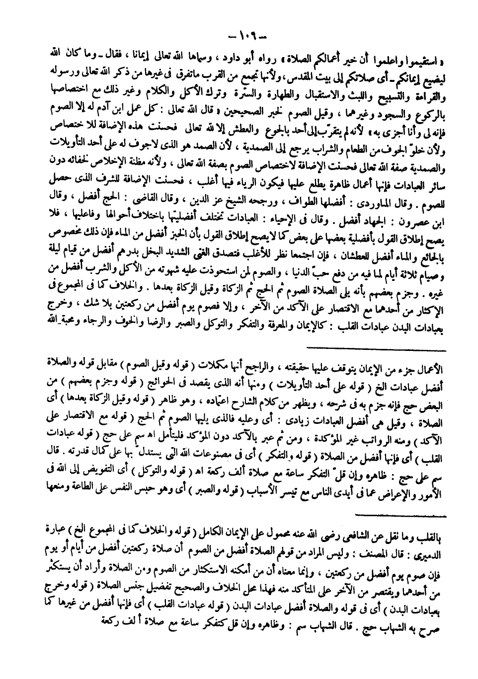 ـــــــــــــــــــــــــــــQبِالْقَلْبِ وَمَا نُقِلَ عَنْ الشَّافِعِيِّ - رَضِيَ اللَّهُ عَنْهُ - مَحْمُولٌ عَلَى الْإِيمَانِ الْكَامِلِ (قَوْلُهُ: وَالْخِلَافُ كَمَا فِي الْمَجْمُوعِ إلَخْ) عِبَارَةُ الدَّمِيرِيِّ: قَالَ الْمُصَنِّفُ: وَلَيْسَ الْمُرَادُ مِنْ قَوْلِهِمْ الصَّلَاةُ أَفْضَلُ مِنْ الصَّوْمِ أَنَّ صَلَاةَ رَكْعَتَيْنِ أَفْضَلُ مِنْ أَيَّامٍ أَوْ يَوْمٍ فَإِنَّ صَوْمَ يَوْمٍ أَفْضَلُ مِنْ رَكْعَتَيْنِ، وَإِنَّمَا مَعْنَاهُ أَنَّ مَنْ أَمْكَنَهُ الِاسْتِكْثَارَ مِنْ الصَّوْمِ وَمِنْ الصَّلَاةِ وَأَرَادَ أَنْ يَسْتَكْثِرَ مِنْ أَحَدِهِمَا وَيَقْتَصِرَ مِنْ الْآخَرِ عَلَى الْمُتَأَكَّدِ مِنْهُ فَهَذَا مَحَلُّ الْخِلَافِ وَالصَّحِيحُ تَفْضِيلُ جِنْسِ الصَّلَاةِ. (قَوْلُهُ: وَخَرَجَ بِعِبَادَاتِ الْبَدَنِ) أَيْ فِي قَوْلِهِ وَالصَّلَاةُ أَفْضَلُ عِبَادَاتِ الْبَدَنِ (قَوْلُهُ: عِبَادَاتُ الْقَلْبِ) أَيْ فَإِنَّهَا أَفْضَلُ مِنْ غَيْرِهَا كَمَا صَرَّحَ بِهِ الشِّهَابُ حَجّ. قَالَ الشِّهَابُ سم: وَظَاهِرُهُ وَإِنْ قَلَّ كَتَفَكُّرِ سَاعَةٍ مَعَ صَلَاةِ أَلْفِ رَكْعَةٍ