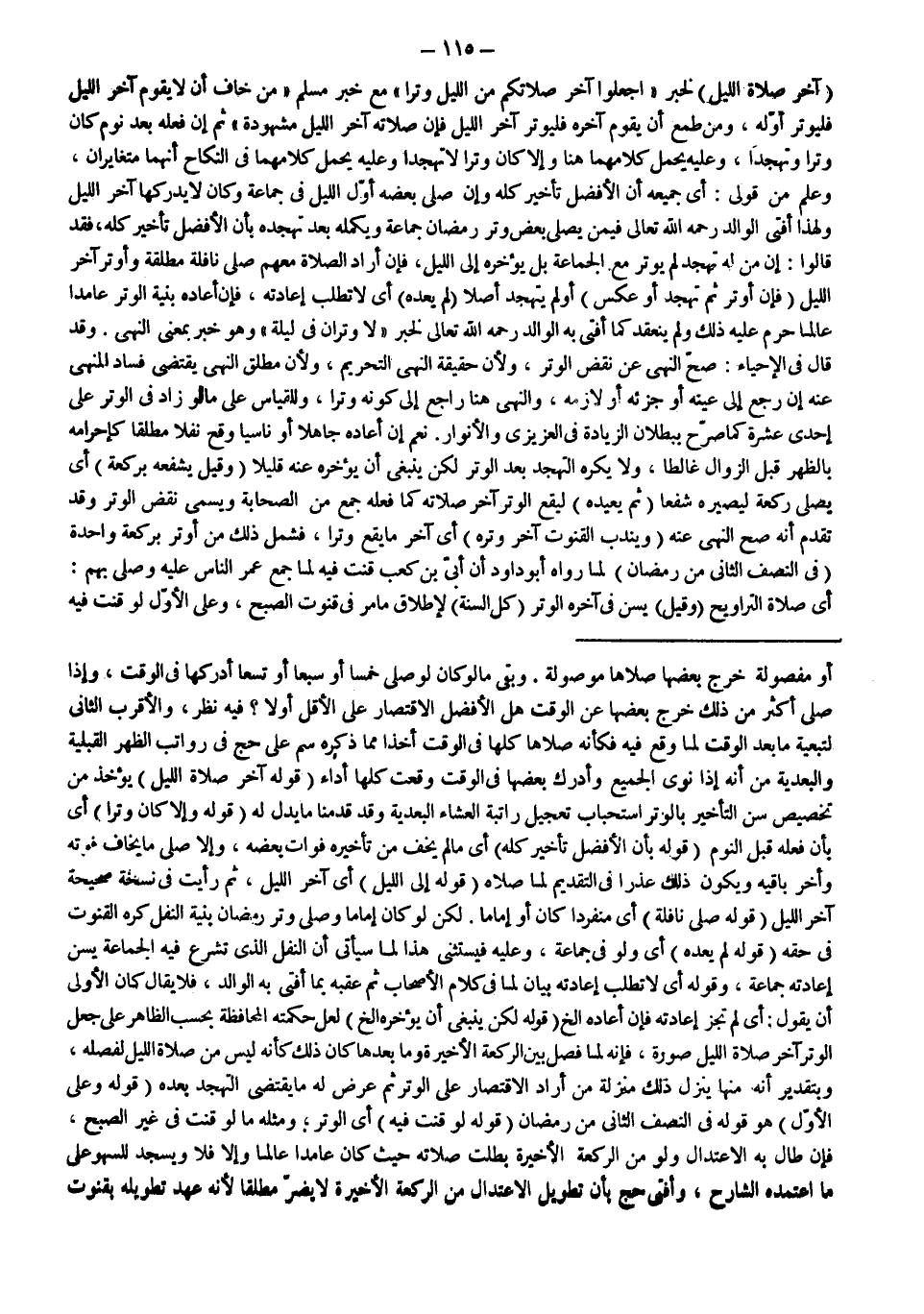(آخِرَ صَلَاةِ اللَّيْلِ) لِخَبَرِ «اجْعَلُوا آخِرَ صَلَاتِكُمْ مِنْ اللَّيْلِ وِتْرًا» مَعَ خَبَرِ مُسْلِمٍ «مَنْ خَافَ أَنْ لَا يَقُومَ آخِرَ اللَّيْلِ فَلْيُوتِرْ أَوَّلَهُ، وَمَنْ طَمِعَ أَنْ يَقُومَ آخِرَهُ فَلْيُوتِرْ آخِرَ اللَّيْلِ فَإِنَّ صَلَاتَهُ آخِرَ اللَّيْلِ مَشْهُودَةٌ» ثُمَّ إنْ فَعَلَهُ بَعْدَ نَوْمٍ كَانَ وِتْرًا وَتَهَجُّدًا، وَعَلَيْهِ يُحْمَلُ كَلَامُهُمْ هُنَا، وَإِلَّا كَانَ وِتْرًا لَا تَهَجُّدًا وَعَلَيْهِ يُحْمَلُ كَلَامُهُمَا فِي النِّكَاحِ أَنَّهُمَا مُتَغَايِرَانِ، وَعُلِمَ مِنْ قَوْلِي: أَيْ جَمِيعُهُ أَنَّ الْأَفْضَلَ تَأْخِيرُ كُلِّهِ، وَإِنْ صَلَّى بَعْضَهُ أَوَّلَ اللَّيْلِ فِي جَمَاعَةٍ وَكَانَ لَا يُدْرِكُهَا آخِرَ اللَّيْلِ وَلِهَذَا أَفْتَى الْوَالِدُ - رَحِمَهُ اللَّهُ تَعَالَى - فِيمَنْ يُصَلِّي بَعْضَ وِتْرِ رَمَضَانَ جَمَاعَةً وَيُكْمِلُهُ بَعْدَ تَهَجُّدِهِ بِأَنَّ الْأَفْضَلَ تَأْخِيرُ كُلِّهِ، فَقَدْ قَالُوا: إنَّ مَنْ لَهُ تَهَجُّدٌ لَمْ يُوتِرْ مَعَ الْجَمَاعَةِ بَلْ يُؤَخِّرُهُ إلَى اللَّيْلِ، فَإِنْ أَرَادَ الصَّلَاةَ مَعَهُمْ صَلَّى نَافِلَةً مُطْلَقَةً وَأَوْتَرَ آخِرَ اللَّيْلِ (فَإِنْ أَوْتَرَ ثُمَّ تَهَجَّدَ أَوْ عَكَسَ) أَوْ لَمْ يَتَهَجَّدْ أَصْلًا (لَمْ يُعِدْهُ) أَيْ لَا تُطْلَبُ إعَادَتُهُ، فَإِنْ أَعَادَهُ بِنِيَّةِ الْوِتْرِ عَامِدًا عَالِمًا حَرُمَ عَلَيْهِ ذَلِكَ، وَلَمْ يَنْعَقِدْ كَمَا أَفْتَى بِهِ الْوَالِدُ - رَحِمَهُ اللَّهُ تَعَالَى - لِخَبَرِ «لَا وِتْرَانِ فِي لَيْلَةٍ» وَهُوَ خَبَرٌ بِمَعْنَى النَّهْيِ.
