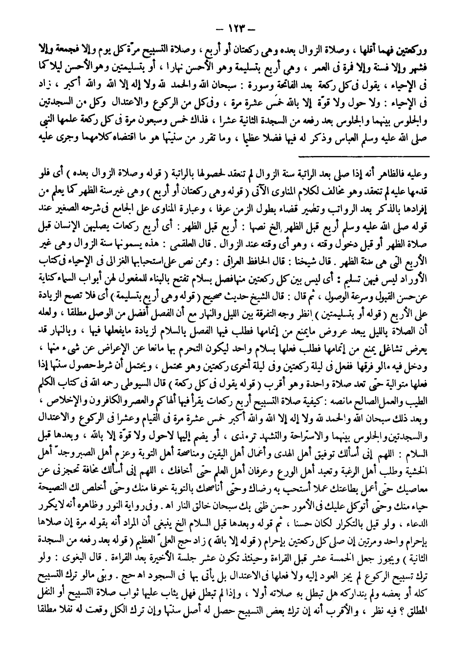 وَرَكْعَتَيْنِ فَهُمَا أَقَلُّهَا، وَصَلَاةُ الزَّوَالِ بَعْدَهُ وَهِيَ رَكْعَتَانِ أَوْ أَرْبَعٌ، وَصَلَاةُ التَّسْبِيحِ مَرَّةً كُلَّ يَوْمٍ، وَإِلَّا فَجُمُعَةٍ، وَإِلَّا فَشَهْرٍ، وَإِلَّا فَسَنَةٍ، وَإِلَّا فَمَرَّةٍ فِي الْعُمُرِ، وَهِيَ أَرْبَعٌ بِتَسْلِيمَةٍ وَهُوَ الْأَحْسَنُ نَهَارًا، أَوْ بِتَسْلِيمَتَيْنِ وَهُوَ الْأَحْسَنُ لَيْلًا كَمَا فِي الْإِحْيَاءِ، يَقُولُ فِي كُلِّ رَكْعَةِ بَعْدَ الْفَاتِحَةِ وَسُورَةٍ: سُبْحَانَ اللَّهِ وَالْحَمْدُ لِلَّهِ وَلَا إلَهَ إلَّا اللَّهُ اللَّهُ أَكْبَرُ، زَادَ فِي الْإِحْيَاءِ: وَلَا حَوْلَ وَلَا قُوَّةَ إلَّا بِاَللَّهِ خَمْسَ عَشْرَةَ مَرَّةً، وَفِي كُلٍّ مِنْ الرُّكُوعِ وَالِاعْتِدَالِ وَكُلٍّ مِنْ السَّجْدَتَيْنِ وَالْجُلُوسِ بَيْنَهُمَا وَالْجُلُوسِ بَعْدَ رَفْعِهِ مِنْ السَّجْدَةِ الثَّانِيَةِ عَشْرًا، فَذَاكَ خَمْسٌ وَسَبْعُونَ مَرَّةً فِي كُلِّ رَكْعَةٍ عَلَّمَهَا النَّبِيُّ - صَلَّى اللَّهُ عَلَيْهِ وَسَلَّمَ - الْعَبَّاسَ وَذَكَرَ لَهُ فِيهَا فَضْلًا عَظِيمًا، وَمَا تَقَرَّرَ مِنْ سُنِّيَّتِهَا هُوَ مَا اقْتَضَاهُ كَلَامُهُمَا وَجَرَى عَلَيْهِ