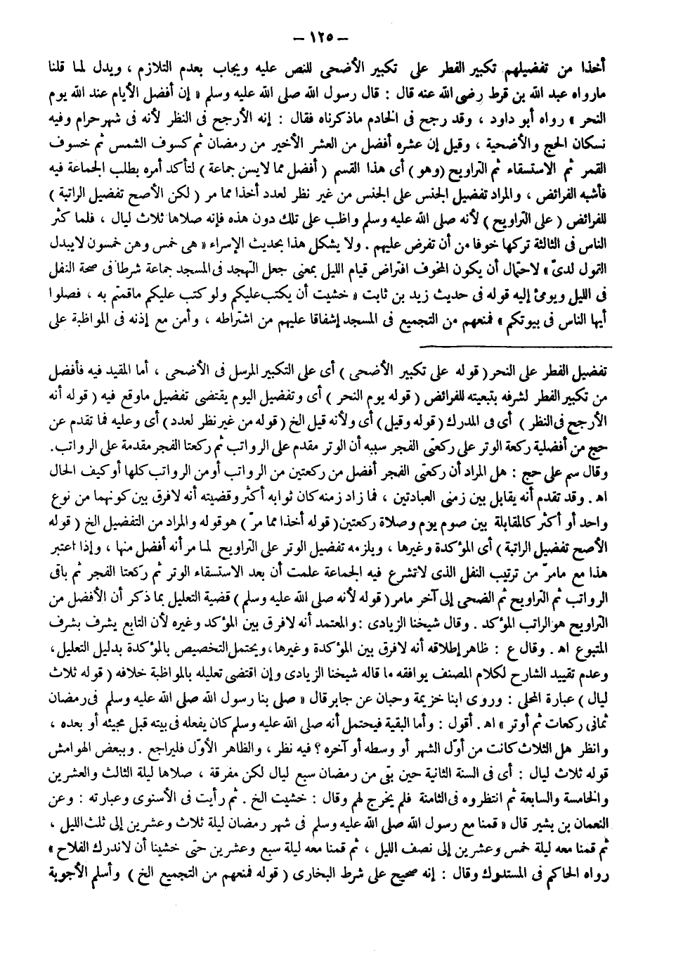 وَبِبَعْضِ الْهَوَامِشِ قَوْلُهُ: ثَلَاثُ لَيَالٍ: أَيْ فِي السَّنَةِ الثَّانِيَةِ حِينَ بَقِيَ مِنْ رَمَضَانَ سَبْعُ لَيَالٍ لَكِنْ مُفَرَّقَةٌ، صَلَّاهَا لَيْلَةَ الثَّالِثِ وَالْعِشْرِينَ وَالْخَامِسَةِ وَالسَّابِعَةِ ثُمَّ انْتَظَرُوهُ فِي الثَّامِنَةِ فَلَمْ يَخْرُجْ لَهُمْ وَقَالَ: خَشِيت إلَخْ. ثُمَّ رَأَيْت فِي الْإِسْنَوِيِّ وَعِبَارَتُهُ: وَعَنْ النُّعْمَانِ بْنِ بَشِيرٍ قَالَ «قُمْنَا مَعَ رَسُولِ اللَّهِ - صَلَّى اللَّهُ عَلَيْهِ وَسَلَّمَ - فِي شَهْرِ رَمَضَانَ لَيْلَةَ ثَلَاثٍ وَعِشْرِينَ إلَى ثُلُثِ اللَّيْلِ، ثُمَّ قُمْنَا مَعَهُ لَيْلَةَ خَمْسٍ وَعِشْرِينَ إلَى نِصْفِ اللَّيْلِ، ثُمَّ قُمْنَا مَعَهُ لَيْلَةَ سَبْعٍ وَعِشْرِينَ حَتَّى خَشِيَنَا أَنْ لَا نُدْرِكَ الْفَلَاحَ» رَوَاهُ الْحَاكِمُ فِي الْمُسْتَدْرَكِ وَقَالَ: إنَّهُ صَحِيحٌ عَلَى شَرْطِ الْبُخَارِيِّ (قَوْلُهُ: فَمَنَعَهُمْ مِنْ التَّجْمِيعِ إلَخْ) وَأَسْلَمُ الْأَجْوِبَةِ