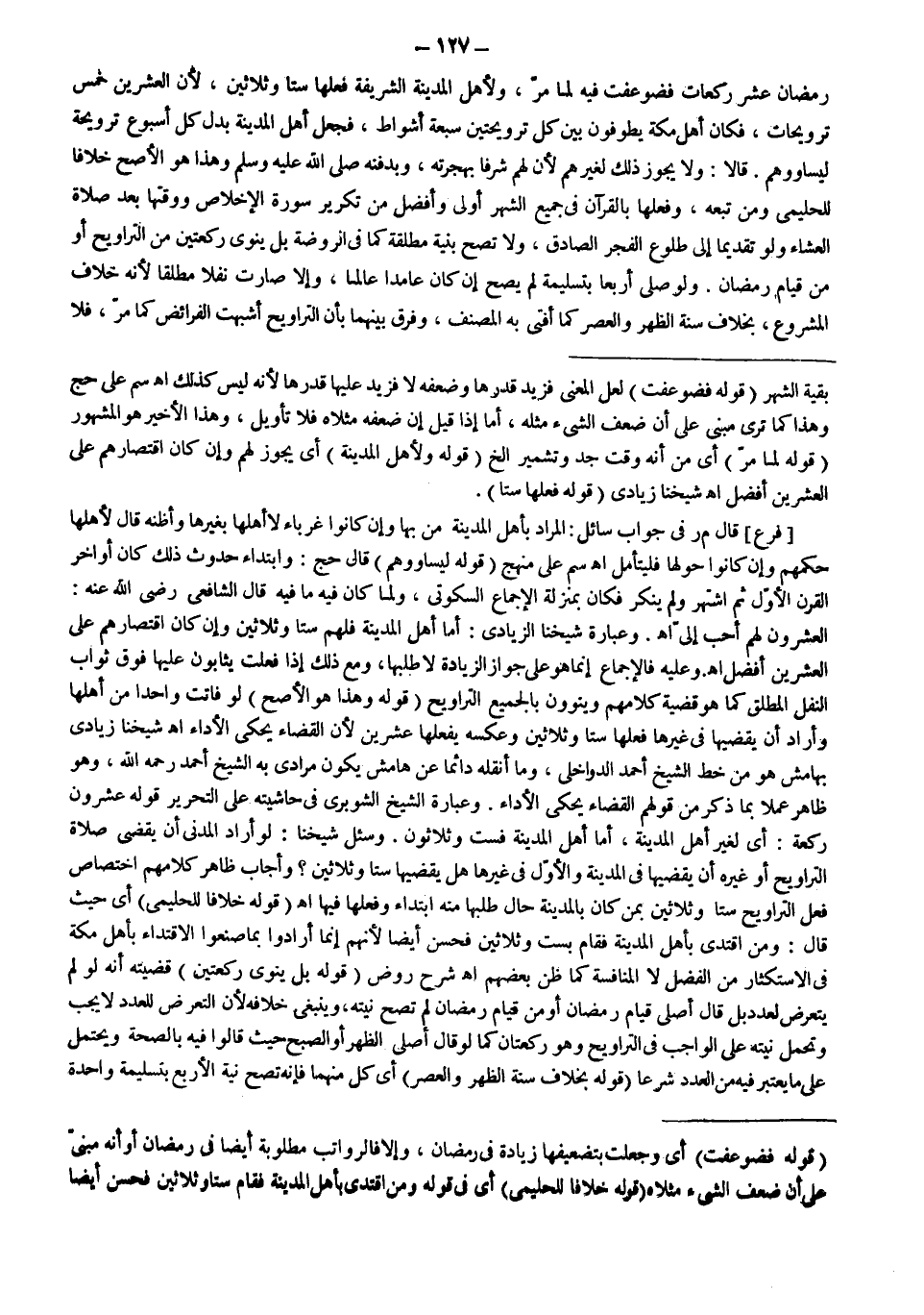 وَعِبَارَةُ الشَّيْخِ الشَّوْبَرِيِّ فِي حَاشِيَتِهِ عَلَى التَّحْرِيرِ قَوْلُهُ: عِشْرُونَ رَكْعَةً: أَيْ لِغَيْرِ أَهْلِ الْمَدِينَةِ، أَمَّا أَهْلُ الْمَدِينَةِ فَسِتٌّ وَثَلَاثُونَ. وَسُئِلَ شَيْخُنَا: لَوْ أَرَادَ الْمَدَنِيُّ أَنْ يَقْضِيَ صَلَاةَ التَّرَاوِيحِ أَوْ غَيْرُهُ أَنْ يَقْضِيَهَا فِي الْمَدِينَةِ وَالْأَوَّلُ فِي غَيْرِهَا هَلْ يَقْضِيهَا سِتًّا وَثَلَاثِينَ؟ وَأَجَابَ ظَاهِرُ كَلَامِهِمْ اخْتِصَاصُ فِعْلِ التَّرَاوِيحِ سِتًّا وَثَلَاثِينَ بِمَنْ كَانَ بِالْمَدِينَةِ حَالَ طَلَبِهَا مِنْهُ ابْتِدَاءً وَفَعَلَهَا فِيهَا. اهـ (قَوْلُهُ: خِلَافًا لِلْحَلِيمِيِّ) أَيْ حَيْثُ قَالَ: وَمَنْ اقْتَدَى بِأَهْلِ الْمَدِينَةِ فَقَامَ بِسِتٍّ وَثَلَاثِينَ فَحَسَنٌ أَيْضًا؛ لِأَنَّهُمْ إنَّمَا أَرَادُوا بِمَا صَنَعُوا الِاقْتِدَاءَ بِأَهْلِ مَكَّةَ فِي الِاسْتِكْثَارِ مِنْ الْفَضْلِ لَا الْمُنَافِسَةَ كَمَا ظَنَّ بَعْضُهُمْ. اهـ شَرْحُ رَوْضِ (قَوْلُهُ: بَلْ يَنْوِي رَكْعَتَيْنِ) قَضِيَّتُهُ أَنَّهُ لَوْ لَمْ يَتَعَرَّضْ لِعَدَدٍ بَلْ قَالَ أُصَلِّي قِيَامَ رَمَضَانَ أَوْ مِنْ قِيَامِ رَمَضَانَ لَمْ تَصِحَّ نِيَّتُهُ، وَيَنْبَغِي خِلَافُهُ؛ لِأَنَّ التَّعَرُّضَ لِلْعَدَدِ لَا يَجِبُ وَتُحْمَلُ نِيَّتُهُ عَلَى الْوَاجِبِ فِي التَّرَاوِيحِ، وَهُوَ رَكْعَتَانِ كَمَا لَوْ قَالَ أُصَلِّي الظُّهْرَ أَوْ الصُّبْحَ حَيْثُ قَالُوا فِيهِ بِالصِّحَّةِ وَيُحْتَمَلُ عَلَى مَا يُعْتَبَرُ فِيهِ مِنْ الْعَدَدِ شَرْعًا (قَوْلُهُ: بِخِلَافِ سُنَّةِ الظُّهْرِ وَالْعَصْرِ) أَيْ كُلٍّ مِنْهُمَا فَإِنَّهُ تَصِحُّ نِيَّةُ الْأَرْبَعِ بِتَسْلِيمَةٍ وَاحِدَةٍ