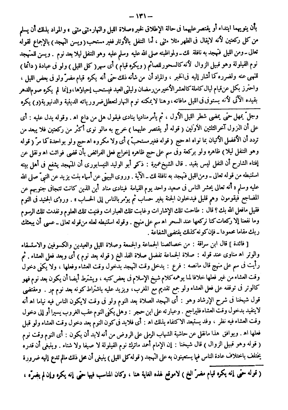 وَنَقَلَ عَنْ إفْتَاءِ الشَّارِحِ أَنَّ النَّفَلَ لَيْسَ بِقَيْدٍ. قَالَ الشَّيْخُ عَمِيرَةُ: ذَكَرَ أَبُو الْوَلِيدِ النَّيْسَابُورِيِّ أَنَّ الْمُتَهَجِّدَ يَشْفَعُ فِي أَهْلِ بَيْتِهِ اسْتَنْبَطَهُ مِنْ قَوْله تَعَالَى {وَمِنَ اللَّيْلِ فَتَهَجَّدْ بِهِ نَافِلَةً لَكَ} [الإسراء: 79] الْآيَةَ. وَرَوَى الْبَيْهَقِيُّ عَنْ أَسْمَاءِ بِنْتِ يَزِيدَ عَنْ النَّبِيِّ - صَلَّى اللَّهُ عَلَيْهِ وَسَلَّمَ - «أَنَّهُ تَعَالَى يَحْشُرُ النَّاسَ فِي صَعِيدٍ وَاحِدٍ يَوْمَ الْقِيَامَةِ فَيُنَادِي مُنَادٍ أَيْنَ الَّذِينَ كَانَتْ تَتَجَافَى جَنُوبُهُمْ عَنْ الْمَضَاجِعِ فَيَقُومُونَ وَهُمْ قَلِيلٌ فَيَدْخُلُونَ الْجَنَّةَ بِغَيْرِ حِسَابٍ ثُمَّ يُؤْمَرُ بِالنَّاسِ إلَى الْحِسَابِ» .