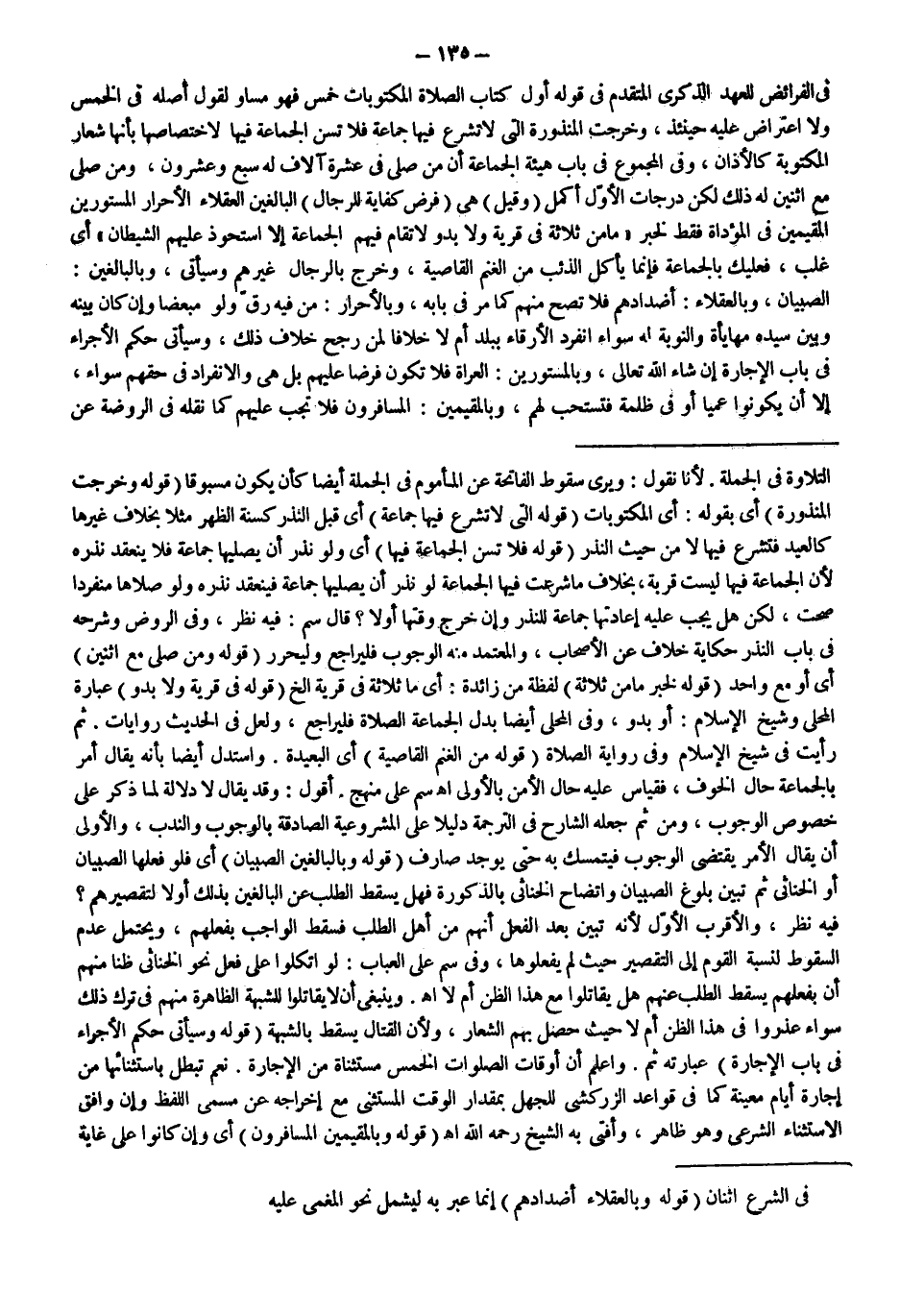 وَيَنْبَغِي أَنْ لَا يُقَاتَلُوا لِلشُّبْهَةِ الظَّاهِرَةِ مِنْهُمْ فِي تَرْكِ ذَلِكَ سَوَاءٌ عُذِرُوا فِي هَذَا الظَّنِّ أَمْ لَا حَيْثُ حَصَلَ بِهِمْ الشِّعَارُ؛ وَلِأَنَّ الْقِتَالَ يَسْقُطُ بِالشُّبْهَةِ (قَوْلُهُ: وَسَيَأْتِي حُكْمُ الْأُجَرَاءِ فِي بَابِ الْإِجَارَةِ) عِبَارَتُهُ ثُمَّ. وَاعْلَمْ أَنَّ أَوْقَاتِ الصَّلَوَاتِ الْخَمْسِ مُسْتَثْنَاةٌ مِنْ الْإِجَارَةِ. نَعَمْ تَبْطُلُ بِاسْتِثْنَائِهَا مِنْ إجَارَةِ أَيَّامٍ مُعَيَّنَةٍ كَمَا فِي قَوَاعِدِ الزَّرْكَشِيّ لِلْجَهْلِ بِمِقْدَارِ الْوَقْتِ الْمُسْتَثْنَى مَعَ إخْرَاجِهِ عَنْ مُسَمَّى اللَّفْظِ، وَإِنْ وَافَقَ الِاسْتِثْنَاءَ الشَّرْعِيَّ وَهُوَ ظَاهِرٌ، وَأَفْتَى بِهِ الشَّيْخُ - رَحِمَهُ اللَّهُ - اهـ (قَوْلُهُ: وَبِالْمُقِيمِينَ الْمُسَافِرُونَ) أَيْ وَإِنْ كَانُوا عَلَى غَايَةٍ