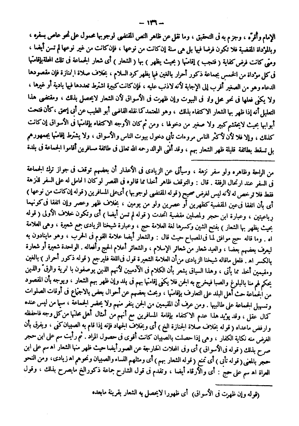فَلَعَلَّ مَا قَالَهُ شَيْخُنَا الزِّيَادِيُّ مِنْ أَنَّ الْعَلَامَةَ الشَّعِيرَةُ قَوْلٌ فِي اللُّغَةِ فَلْيُرَاجَعْ (قَوْلُهُ: ذُكُورٍ أَحْرَارٍ) بَالِغِينَ وَمُقِيمِينَ أَخْذٌ مِمَّا يَأْتِي، وَهَذَا السِّيَاقُ يُشْعِرُ بِأَنَّ الْكَلَامَ فِي الْآدَمِيِّينَ؛ لِأَنَّهُمْ الَّذِينَ يُوصَفُونَ بِالْحُرِّيَّةِ وَالرِّقِّ وَاَلَّذِينَ يَحْكُمُ لَهُمْ مِنَّا بِالْبُلُوغِ وَالصِّبَا فَيَخْرُجُ بِهِ الْجِنُّ فَلَا يَكْفِي إقَامَتُهَا بِهِمْ فِي بَلَدٍ وَإِنْ ظَهَرَ بِهِمْ الشَّعَارُ.