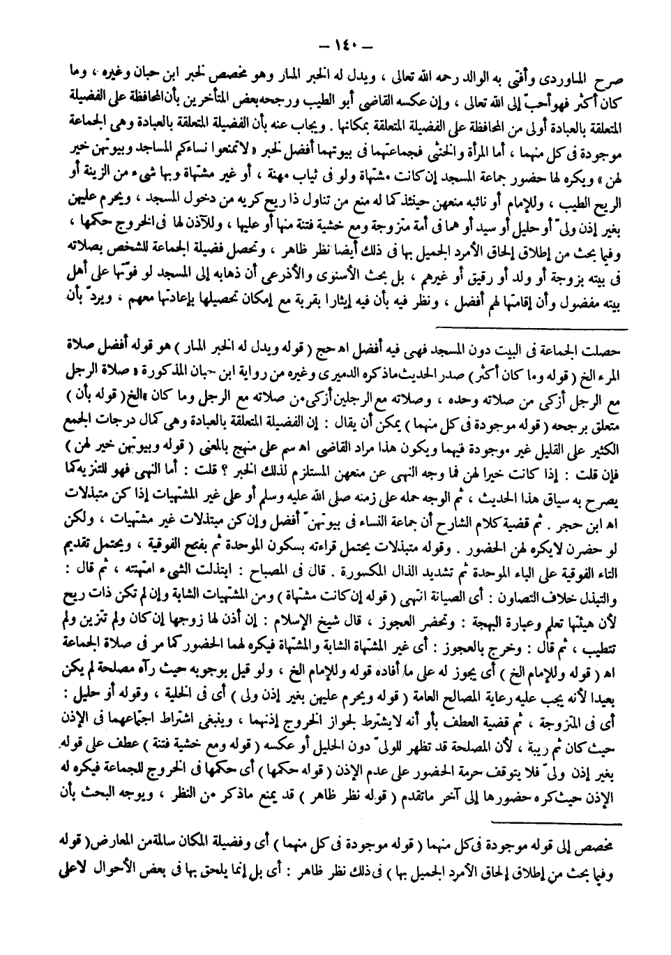 صَرَّحَ الْمَاوَرْدِيُّ وَأَفْتَى بِهِ الْوَالِدُ - رَحِمَهُ اللَّهُ تَعَالَى -، وَيَدُلُّ لَهُ الْخَبَرُ الْمَارُّ وَهُوَ مُخَصِّصٌ لِخَبَرِ ابْنِ حِبَّانَ وَغَيْرِهِ، وَمَا كَانَ أَكْثَرَ فَهُوَ أَحَبُّ إلَى اللَّهِ تَعَالَى، وَإِنْ عَكَسَهُ الْقَاضِي أَبُو الطَّيِّبِ وَرَجَّحَهُ بَعْضُ الْمُتَأَخِّرِينَ بِأَنَّ الْمُحَافَظَةَ عَلَى الْفَضِيلَةِ الْمُتَعَلِّقَةِ بِالْعِبَادَةِ أَوْلَى مِنْ الْمُحَافَظَةِ عَلَى الْفَضِيلَةِ الْمُتَعَلِّقَةِ بِمَكَانِهَا. وَيُجَابُ عَنْهُ بِأَنَّ الْفَضِيلَةَ الْمُتَعَلِّقَةَ بِالْعِبَادَةِ وَهِيَ الْجَمَاعَةُ مَوْجُودَةٌ فِي كُلٍّ مِنْهُمَا، أَمَّا الْمَرْأَةُ وَالْخُنْثَى فَجَمَاعَتُهُمَا فِي بُيُوتِهِمَا أَفْضَلُ لِخَبَرِ «لَا تَمْنَعُوا نِسَاءَكُمْ الْمَسَاجِدَ وَبُيُوتُهُنَّ خَيْرٌ لَهُنَّ» وَيُكْرَهُ لَهَا حُضُورُ جَمَاعَةِ الْمَسْجِدِ إنْ كَانَتْ مُشْتَهَاةً وَلَوْ فِي ثِيَابِ مِهْنَةٍ، أَوْ غَيْرَ مُشْتَهَاةٍ وَبِهَا شَيْءٌ مِنْ الزِّينَةِ أَوْ الرِّيحِ الطَّيِّبِ، وَلِلْإِمَامِ أَوْ نَائِبِهِ مَنْعُهُنَّ حِينَئِذٍ كَمَا لَهُ مَنْعُ مَنْ تَنَاوَلَ ذَا رِيحٍ كَرِيهٍ مِنْ دُخُولِ الْمَسْجِدِ، وَيَحْرُمُ عَلَيْهِنَّ بِغَيْرِ إذْنِ وَلِيٍّ أَوْ حَلِيلٍ أَوْ سَيِّدٍ أَوْ هُمَا فِي أَمَةٍ مُتَزَوِّجَةٍ وَمَعَ خَشْيَةِ فِتْنَةٍ مِنْهَا أَوْ عَلَيْهَا، وَلِلْآذِنِ لَهَا فِي الْخُرُوجِ حُكْمُهَا، وَفِيمَا بَحَثَ مِنْ إطْلَاقِ إلْحَاقِ الْأَمْرَدِ الْجَمِيلِ بِهَا فِي ذَلِكَ أَيْضًا نَظَرٌ ظَاهِرٌ.