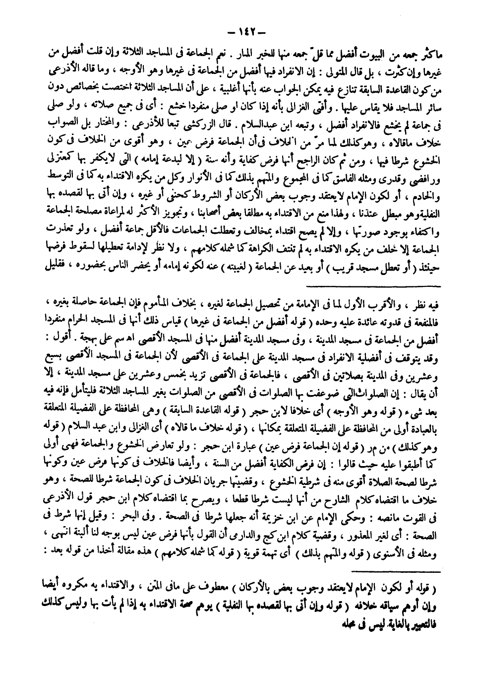 مَا كَثُرَ جَمْعُهُ مِنْ الْبُيُوتِ أَفْضَلُ مِمَّا قَلَّ جَمْعُهُ مِنْهَا لِلْخَبَرِ الْمَارِّ. نَعَمْ الْجَمَاعَةُ فِي الْمَسَاجِدِ الثَّلَاثَةِ، وَإِنْ قَلَّتْ أَفْضَلُ مِنْ غَيْرِهَا، وَإِنْ كَثُرَتْ، بَلْ قَالَ الْمُتَوَلِّي: إنَّ الِانْفِرَادَ فِيهَا أَفْضَلُ مِنْ الْجَمَاعَةِ فِي غَيْرِهَا وَهُوَ الْأَوْجَهُ وَمَا قَالَهُ الْأَذْرَعِيُّ مِنْ كَوْنِ الْقَاعِدَةِ السَّابِقَةِ تُنَازِعُ فِيهِ يُمْكِنُ الْجَوَابُ عَنْهُ بِأَنَّهَا أَغْلَبِيَّةٌ، عَلَى أَنَّ الْمَسَاجِدَ الثَّلَاثَةَ اخْتَصَّتْ بِخَصَائِصَ دُونَ سَائِرِ الْمَسَاجِدِ فَلَا يُقَاسُ عَلَيْهَا.