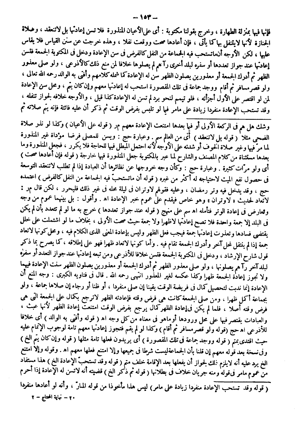 فَإِنَّهَا فِيهَا بِمَنْزِلَةِ الطَّهَارَةِ، وَخَرَجَ بِقَوْلِنَا مَكْتُوبَةً: أَيْ عَلَى الْأَعْيَانِ الْمَنْذُورَةِ فَلَا تُسَنُّ إعَادَتُهَا بَلْ لَا تَنْعَقِدُ، وَصَلَاةُ الْجِنَازَةِ؛ لِأَنَّهَا لَا يُتَنَفَّلُ بِهَا كَمَا يَأْتِي، فَإِنْ أَعَادَهَا صَحَّتْ وَوَقَعَتْ نَفْلًا، وَهَذِهِ خَرَجَتْ عَنْ سُنَنِ الْقِيَاسِ فَلَا يُقَاسُ عَلَيْهَا، لَكِنَّ الْأَوْجَهَ أَنَّ مَا تُسْتَحَبُّ فِيهِ الْجَمَاعَةُ مِنْ النَّفْلِ كَالْفَرْضِ فِي سَنِّ الْإِعَادَةِ وَدَخَلَ فِي الْمَكْتُوبَةِ الْجُمُعَةُ فَتُسَنُّ إعَادَتُهَا عِنْدَ جَوَازِ تَعَدُّدِهَا أَوْ سَفَرِهِ لِبَلَدٍ أُخْرَى رَآهُمْ لَمْ يُصَلُّوهَا خِلَافًا لِمَنْ مَنَعَ ذَلِكَ كَالْأَذْرَعِيِّ، وَلَوْ صَلَّى مَعْذُورٌ الظُّهْرَ ثُمَّ أَدْرَكَ الْجُمُعَةَ أَوْ مَعْذُورِينَ يُصَلُّونَ الظُّهْرَ سُنَّ لَهُ الْإِعَادَةُ كَمَا شَمِلَهُ كَلَامُهُمْ وَأَفْتَى بِهِ الْوَالِدُ - رَحِمَهُ اللَّهُ تَعَالَى -، وَلَوْ قَصَرَ مُسَافِرٌ ثُمَّ أَقَامَ وَوَجَدَ جَمَاعَةً فِي تِلْكَ الْمَقْصُورَةِ اُسْتُحِبَّ لَهُ إعَادَتُهَا مَعَهُمْ، وَإِنْ كَانَ يُتِمُّ، وَمَحَلُّ سَنِّ الْإِعَادَةِ لِمَنْ لَوْ اقْتَصَرَ عَلَى الْأَوَّلِ أَجْزَأَتْهُ، فَلَوْ تَيَمَّمَ لِنَحْوِ بَرْدٍ لَمْ تُسَنَّ لَهُ الْإِعَادَةُ كَذَا قِيلَ.