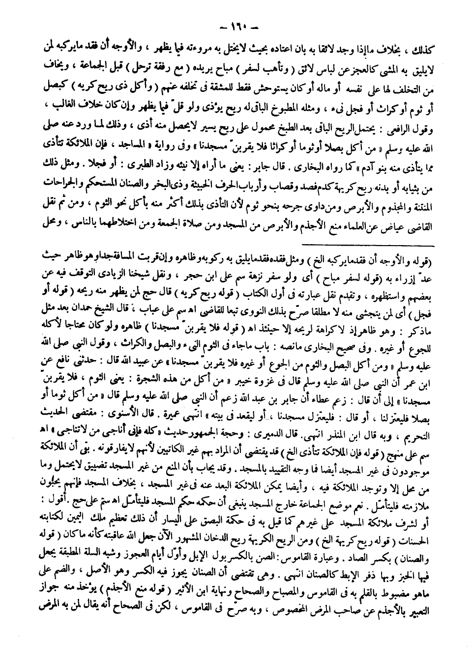 (وَأَكْلُ ذِي رِيحٍ كَرِيهٍ) كَبَصَلٍ أَوْ ثُومٍ أَوْ كُرَّاثٍ أَوْ فُجْلٍ نِيءٌ، وَمِثْلُهُ الْمَطْبُوخُ الْبَاقِي لَهُ رِيحٌ قُنَّا وَلَوْ قَلَّ فِيمَا يَظْهَرُ، وَإِنْ كَانَ خِلَافُ الْغَالِبِ، وَقَوْلُ الرَّافِعِيِّ: يُحْتَمَلُ الرِّيحُ الْبَاقِي بَعْدَ الطَّبْخِ مَحْمُولٌ عَلَى رِيحٍ يَسِيرٍ لَا يَحْصُلُ مِنْهُ أَذًى، وَذَلِكَ لِمَا وَرَدَّ عَنْهُ - صَلَّى اللَّهُ عَلَيْهِ وَسَلَّمَ - «مَنْ أَكَلَ بَصَلًا أَوْ ثُومًا أَوْ كُرَّاثًا فَلَا يَقْرَبَنَّ مَسْجِدَنَا» وَفِي رِوَايَةٍ «الْمَسَاجِدَ، فَإِنَّ الْمَلَائِكَةَ تَتَأَذَّى مِمَّا يَتَأَذَّى مِنْهُ بَنُو آدَمَ» كَمَا رَوَاهُ الْبُخَارِيُّ.