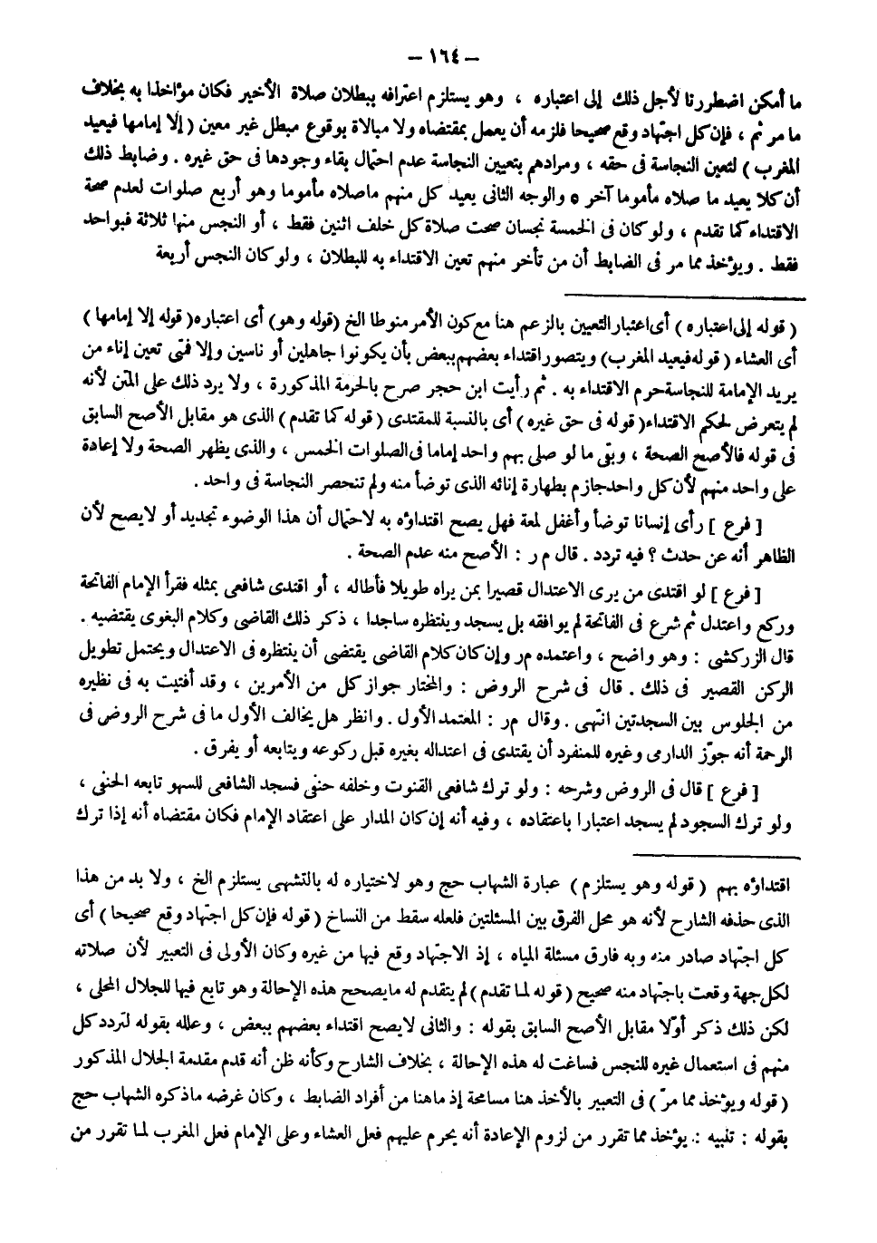 مَا أَمْكَنَ اُضْطُرِرْنَا؛ لِأَجْلِ ذَلِكَ إلَى اعْتِبَارِهِ، وَهُوَ يَسْتَلْزِمُ اعْتِرَافَهُ بِبُطْلَانِ صَلَاةِ الْأَخِيرِ فَكَانَ مُؤَاخَذًا بِهِ بِخِلَافِ مَا مَرَّ ثَمَّ، فَإِنَّ كُلَّ اجْتِهَادٍ وَقَعَ صَحِيحًا فَلَزِمَهُ أَنْ يَعْمَلَ بِمُقْتَضَاهُ وَلَا مُبَالَاةَ بِوُقُوعِ مُبْطِلٍ غَيْرِ مُعَيَّنٍ (إلَّا إمَامَهَا فَيُعِيدُ الْمَغْرِبَ) لِتَعَيُّنِ النَّجَاسَةِ فِي حَقِّهِ، وَمُرَادُهُمْ بِتَعَيُّنِ النَّجَاسَةِ عَدَمُ احْتِمَالِ بَقَاءِ وُجُودِهَا فِي حَقِّ غَيْرِهِ. وَضَابِطُ ذَلِكَ أَنَّ كُلًّا يُعِيدُ مَا صَلَّاهُ مَأْمُومًا آخَرَ.