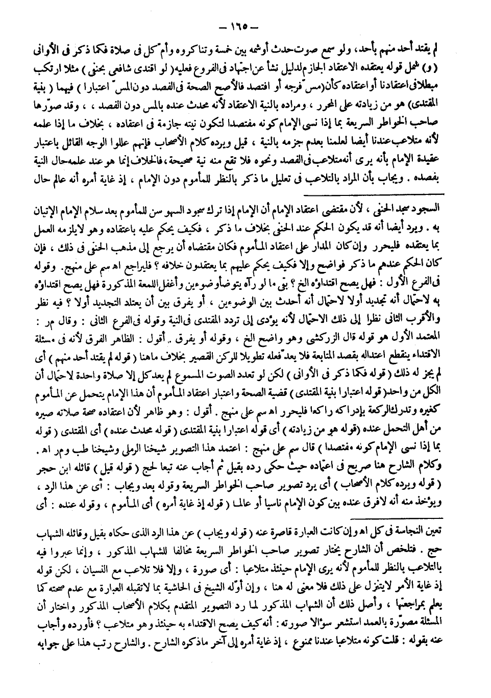 وَكَلَامُ الشَّارِحِ هُنَا صَرِيحٌ فِي اعْتِمَادِهِ حَيْثُ حَكَى رَدَّهُ بِقِيلِ ثُمَّ أَجَابَ عَنْهُ تَبَعًا لحج (قَوْلُهُ: قِيلَ) قَائِلُهُ ابْنُ حَجَرٍ (قَوْلُهُ: وَيَرُدُّهُ كَلَامُ الْأَصْحَابِ) أَيْ يَرُدُّ تَصْوِيرَ صَاحِبِ الْخَوَاطِرِ السَّرِيعَةِ وَقَوْلُهُ بَعْدُ وَيُجَابُ: أَيْ عَنْ هَذَا الرَّدِّ، وَيُؤْخَذُ مِنْهُ أَنَّهُ لَا فَرْقَ عِنْدَهُ بَيْنَ كَوْنِ الْإِمَامِ نَاسِيًا أَوْ عَالِمًا (قَوْلُهُ: إذْ غَايَةُ أَمْرِهِ) أَيْ الْمَأْمُومِ، وَقَوْلُهُ عِنْدَهُ: أَيْ