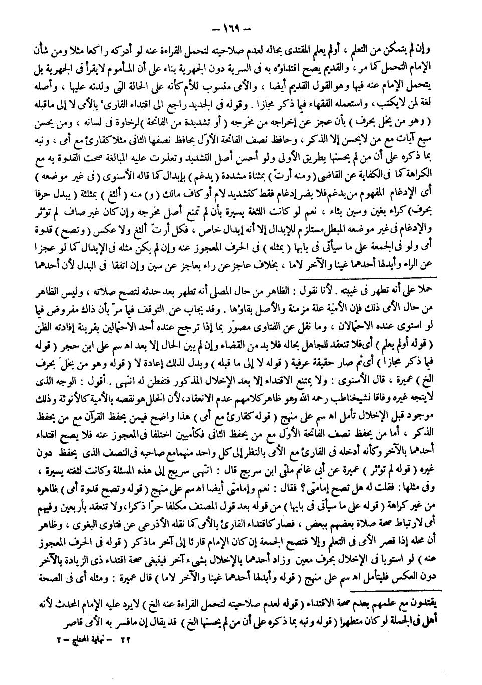 وَإِنْ لَمْ يَتَمَكَّنْ مِنْ التَّعَلُّمِ، أَوْ لَمْ يَعْلَمْ الْمُقْتَدِي بِحَالِهِ؛ لِعَدَمِ صَلَاحِيَّتِهِ لِتَحَمُّلِ الْقِرَاءَةِ عَنْهُ لَوْ أَدْرَكَهُ رَاكِعًا مَثَلًا وَمِنْ شَأْنِ الْإِمَامِ التَّحَمُّلُ كَمَا مَرَّ، وَالْقَدِيمُ يَصِحُّ اقْتِدَاؤُهُ بِهِ فِي السَّرِيَّةِ دُونَ الْجَهْرِيَّةِ بِنَاءً عَلَى أَنَّ الْمَأْمُومَ لَا يَقْرَأُ فِي الْجَهْرِيَّةِ بَلْ يَتَحَمَّلُ الْإِمَامُ عَنْهُ فِيهَا، وَهُوَ الْقَوْلُ الْقَدِيمُ أَيْضًا، وَالْأُمِّيُّ مَنْسُوبٌ لِلْأُمِّ كَأَنَّهُ عَلَى الْحَالَةِ الَّتِي وَلَدَتْهُ عَلَيْهَا، وَأَصْلُهُ لُغَةً لِمَنْ لَا يَكْتُبُ، وَاسْتَعْمَلَهُ الْفُقَهَاءُ فِيمَا ذُكِرَ مَجَازًا.