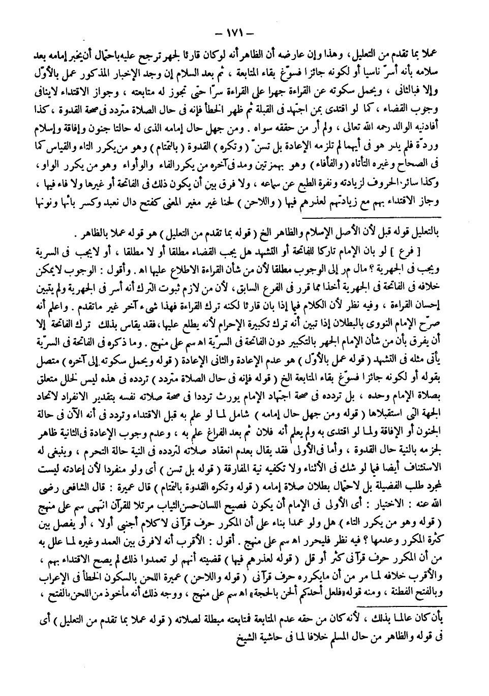 [فَرْعٌ] لَوْ بَانَ الْإِمَامُ تَارِكًا لِلْفَاتِحَةِ أَوْ التَّشَهُّدِ هَلْ يَجِبُ الْقَضَاءُ مُطْلَقًا أَوْ لَا مُطْلَقًا، أَوْ لَا يَجِبُ فِي السَّرِيَّةِ وَيَجِبُ فِي الْجَهْرِيَّةِ؟ مَالَ م ر إلَى الْوُجُوبِ مُطْلَقًا؛ لِأَنَّ مِنْ شَأْنِ الْقِرَاءَةِ الِاطِّلَاعَ عَلَيْهَا. اهـ.