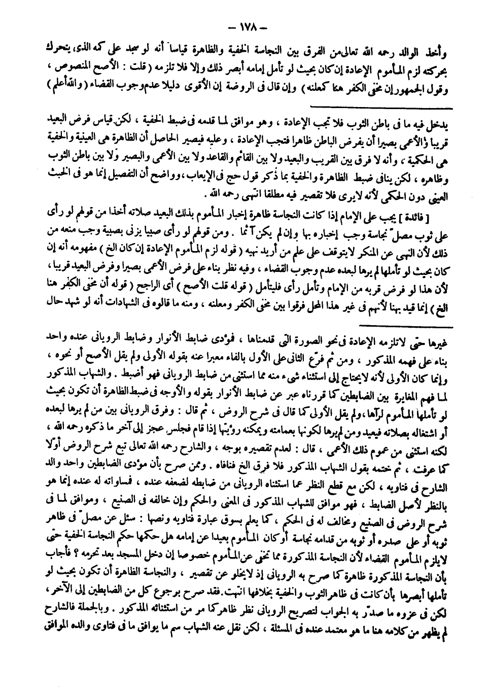 وَمِمَّنْ صَرَّحَ بِأَنَّ مُؤَدَّى الضَّابِطَيْنِ وَاحِدٌ وَالِدُ الشَّارِحِ فِي فَتَاوِيهِ، لَكِنْ مَعَ قَطْعِ النَّظَرِ هُمَا اسْتَثْنَاهُ الرُّويَانِيُّ مِنْ ضَابِطِهِ لِضَعْفِهِ عِنْدَهُ، فَمُسَاوَاتُهُ لَهُ عِنْدَهُ إنَّمَا هُوَ بِالنَّظَرِ لِأَصْلِ الضَّابِطِ، فَهُوَ مُوَافِقٌ لِلشِّهَابِ الْمَذْكُورِ فِي الْمَعْنَى وَالْحُكْمِ وَإِنْ خَالَفَهُ فِي الصَّنِيعِ، وَمُوَافِقٌ لِمَا فِي شَرْحِ الرَّوْضِ فِي الصَّنِيعِ وَمُخَالِفٌ لَهُ فِي الْحُكْمِ، كَمَا يُعْلَمُ بِسَوْقِ عِبَارَةِ فَتَاوِيهِ وَنَصُّهَا: سُئِلَ عَنْ مُصَلٍّ فِي ظَاهِرِ ثَوْبِهِ أَوْ عَلَى صَدْرِهِ أَوْ ثَوْبِهِ مِنْ قُدَّامِهِ نَجَاسَةٌ أَوْ كَانَ الْمَأْمُومُ بَعِيدًا عَنْ إمَامِهِ هَلْ حُكْمُهَا حُكْمُ النَّجَاسَةِ الْخَفِيَّةِ حَتَّى لَا يَلْزَمُ الْمَأْمُومَ الْقَضَاءُ؛ لِأَنَّ النَّجَاسَةَ الْمَذْكُورَةَ مِمَّا تَخْفَى عَنْ الْمَأْمُومِ خُصُوصًا إنْ دَخَلَ الْمَسْجِدَ بَعْدَ تَحَرُّمِهِ؟ فَأَجَابَ بِأَنَّ النَّجَاسَةَ الْمَذْكُورَةَ ظَاهِرَةٌ كَمَا صَرَّحَ بِهِ الرُّويَانِيُّ إذْ لَا يَخْلُو عَنْ تَقْصِيرٍ، وَالنَّجَاسَةُ الظَّاهِرَةُ أَنْ تَكُونَ بِحَيْثُ لَوْ تَأَمَّلَهَا أَبْصَرَهَا بِأَنْ كَانَتْ فِي ظَاهِرِ الثَّوْبِ وَالْخَفِيَّةُ بِخِلَافِهَا انْتَهَتْ.