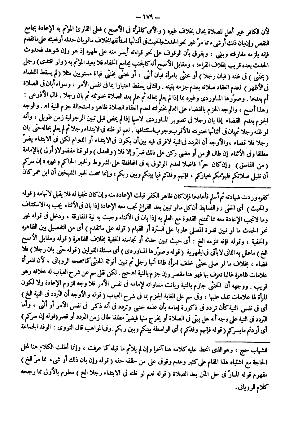 وَالْوَجْهُ الْجَزْمُ بِعَدَمِ الْقَضَاءِ إذَا بَانَ رَجُلًا فِي تَصْوِيرِ الْمَاوَرْدِيِّ لَا سِيَّمَا إذَا لَمْ يَمْضِ قَبْلَ تَبَيُّنِ الرُّجُولِيَّةِ زَمَنٌ طَوِيلٌ، وَأَنَّهُ لَوْ ظَنَّهُ رَجُلًا ثُمَّ بَانَ فِي أَثْنَائِهَا خُنُوثَتُهُ فَالْأَقْرَبُ وُجُوبُ اسْتِئْنَافِهَا. نَعَمْ لَوْ ظَنَّهُ فِي الِابْتِدَاءِ رَجُلًا ثُمَّ لَمْ يَعْلَمْ بِحَالِهِ حَتَّى بَانَ رَجُلًا فَلَا قَضَاءَ، وَالْأَوْجَهُ أَنَّ التَّرَدُّدَ فِي النِّيَّةِ لَا فَرْقَ فِيهِ بَيْنَ أَنْ يَكُونَ فِي الِابْتِدَاءِ أَوْ الدَّوَامِ لَكِنْ فِي الِابْتِدَاءِ يَضُرُّ مُطْلَقًا وَفِي الْأَثْنَاءِ إنْ طَالَ الزَّمَنُ أَوْ مَضَى رُكْنٌ عَلَى ذَلِكَ ضَرَّ، وَإِلَّا فَلَا.