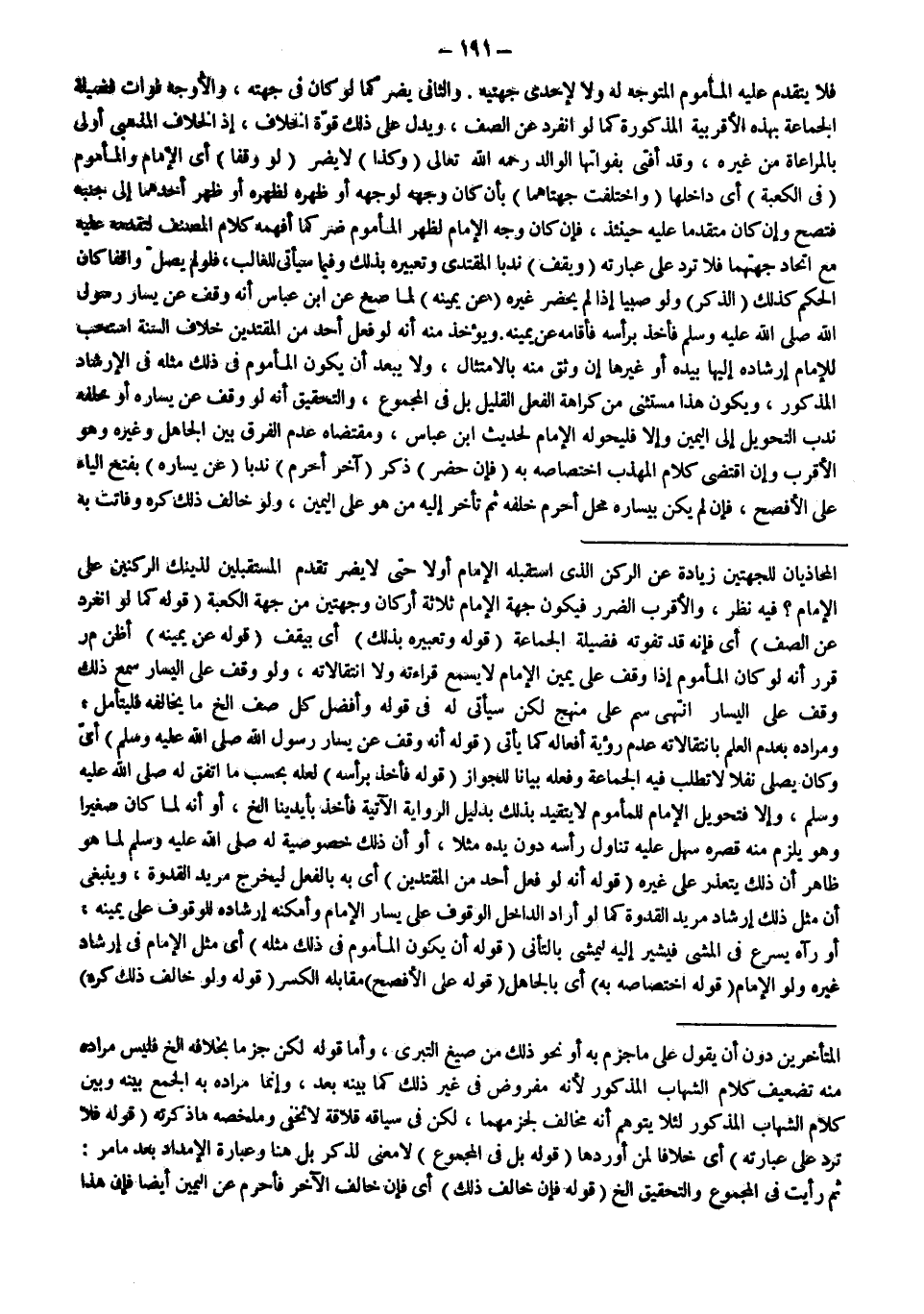 ـــــــــــــــــــــــــــــSالْمُحَاذِيَانِ لِلْجِهَتَيْنِ زِيَادَةً عَنْ الرُّكْنِ الَّذِي اسْتَقْبَلَهُ الْإِمَامُ أَوْ لَا حَتَّى لَا يَضُرَّ تَقَدُّمُ الْمُسْتَقْبِلِينَ لِذَيْنِك الرُّكْنَيْنِ عَلَى الْإِمَامِ؟ فِيهِ نَظَرٌ، وَالْأَقْرَبُ الضَّرَرُ فَيَكُونُ جِهَةُ الْإِمَامِ ثَلَاثَةَ أَرْكَانٍ وَجِهَتَيْنِ مِنْ جِهَةِ الْكَعْبَةِ.