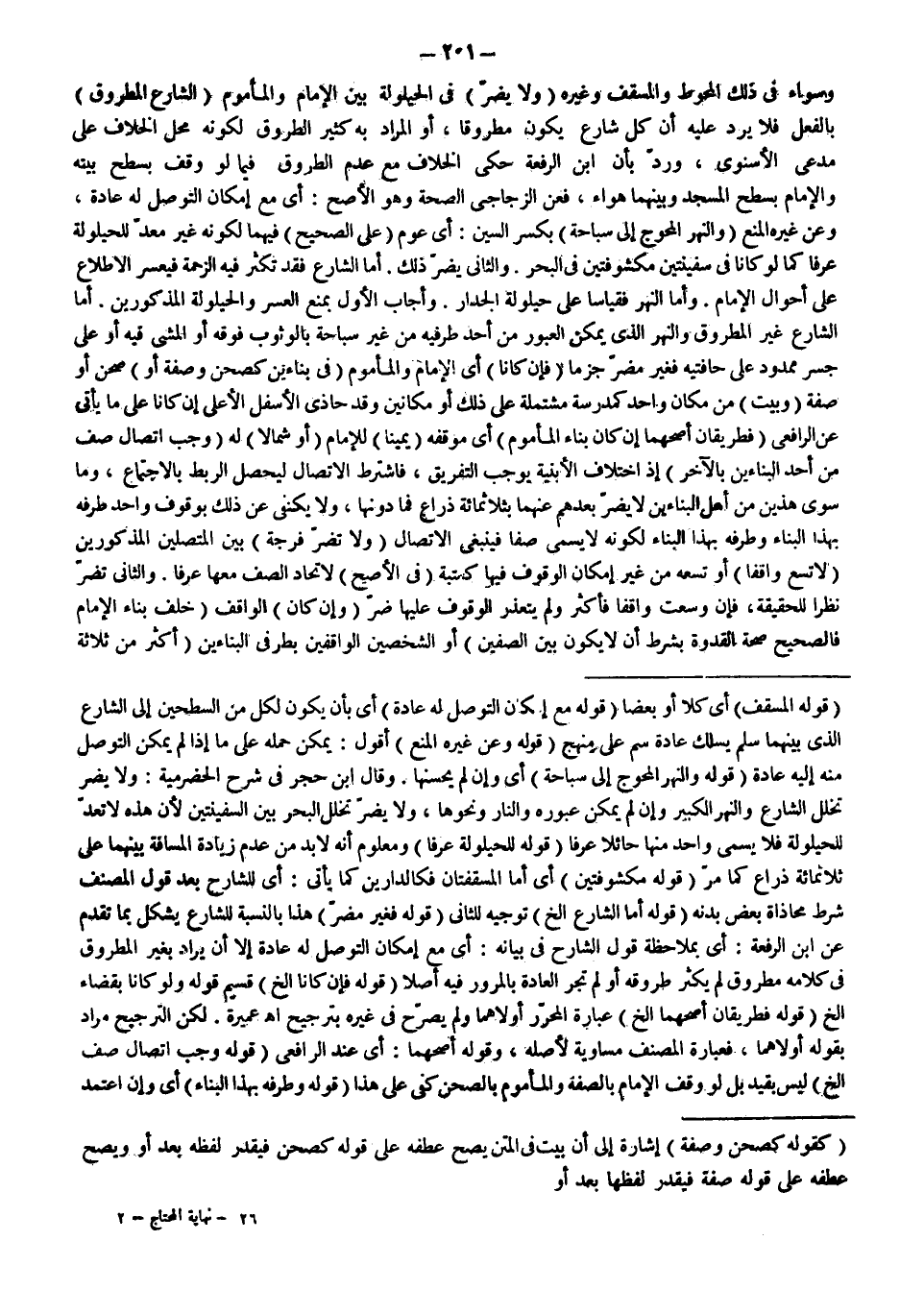 وَسَوَاءٌ فِي ذَلِكَ الْمُحَوَّطُ وَالْمُسَقَّفُ وَغَيْرُهُ (وَلَا يَضُرُّ) فِي الْحَيْلُولَةِ بَيْنَ الْإِمَامِ وَالْمَأْمُومِ (الشَّارِعُ الْمَطْرُوقُ) بِالْفِعْلِ فَلَا يَرُدُّ عَلَيْهِ أَنَّ كُلَّ شَارِعٍ يَكُونُ مَطْرُوقًا، أَوْ الْمُرَادُ بِهِ كَثِيرُ الطُّرُوقِ لِكَوْنِهِ مَحَلُّ الْخِلَافِ عَلَى مُدَّعَى الْإِسْنَوِيِّ، وَرُدَّ بِأَنَّ ابْنَ الرِّفْعَةَ حَكَى الْخِلَافَ مَعَ عَدَمِ الطُّرُوقِ فِيمَا لَوْ وَقَفَ بِسَطْحِ بَيْتِهِ وَالْإِمَامُ بِسَطْحِ الْمَسْجِدِ وَبَيْنَهُمَا هَوَاءٌ، فَعَنْ الزَّجَّاجِيِّ الصِّحَّةُ وَهُوَ الْأَصَحُّ: أَيْ مَعَ إمْكَانِ التَّوَصُّلِ لَهُ عَادَةً، وَعَنْ غَيْرِهِ الْمَنْعُ (وَالنَّهْرُ الْمُحْوِجُ إلَى سِبَاحَةٍ) بِكَسْرِ السِّينِ: أَيْ عَوْمٍ (عَلَى الصَّحِيحِ) فِيهِمَا لِكَوْنِهِ غَيْرَ مُعَدٍّ لِلْحَيْلُولَةِ عُرْفًا كَمَا لَوْ كَانَا فِي سَفِينَتَيْنِ مَكْشُوفَتَيْنِ فِي الْبَحْرِ.