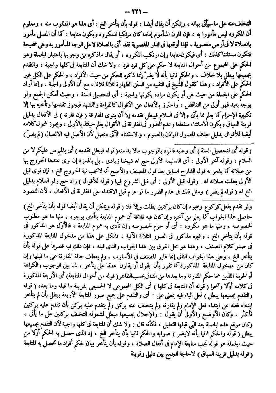وَعَلَى هَذَا الْجَوَابُ الثَّانِي إنَّمَا غَايَرَ الْمُصَنِّفُ فِي الْأُسْلُوبِ، وَلَمْ يَعْطِفْ حَالَةَ الْمُقَارَنَةِ عَلَى مَا قَبْلَهَا وَإِنْ كَانَ مِنْ مَدْخُولِ الْمُتَابَعَةِ الْمَذْكُورَةِ كَمَا تَقَرَّرَ بِأَنْ يَقُولَ أَوْ يُقَارِنَ عَطْفًا عَلَى يَتَأَخَّرَ، لِمَا بَيْنَ الْوُجُوبِ وَالْكَرَاهَةِ أَوْ الْحُرْمَةِ اللَّذَيْنِ هُمَا حُكْمُ الْمُقَارَنَةِ وَمَا بَعْدَهَا مِنْ التَّنَافِي بِحَسَبِ الظَّاهِرِ (قَوْلُهُ: مِنْ أَحْوَالِ الْمُتَابَعَةِ) أَيْ الْأَرْبَعَةِ الْمَذْكُورَةِ فِي كَلَامِهِ أَوَّلًا وَآخِرًا (قَوْلُهُ: أَنَّ الْمُتَابَعَةَ فِي كُلِّهَا) أَيْ الْكُلِّ الْمَجْمُوعِيِّ لَا الْجَمِيعِيِّ بِقَرِينَةِ مَا قَبْلَهُ وَمَا بَعْدَهُ (قَوْلُهُ: وَالتَّقَدُّمُ بِجَمِيعِهَا يُبْطِلُ) لَعَلَّ الْبَاءَ فِيهِ بِمَعْنَى عَلَى: أَيْ وَالتَّقَدُّمُ عَلَى جَمِيعِ صُوَرِ الْمُتَابَعَةِ الْأَرْبَعَةِ يُبْطِلُ بِأَنْ لَمْ يَتَأَخَّرْ ابْتِدَاءُ فِعْلِهِ عَنْ ابْتِدَاءِ فِعْلِ الْإِمَامِ وَلَمْ يُقَارِنْهُ وَلَمْ يَتَخَلَّفْ عَنْهُ بِرُكْنٍ وَلَمْ يَتَقَدَّمْ عَلَيْهِ بِرُكْنٍ بِأَنْ تَقَدَّمَ عَلَيْهِ بِرُكْنَيْنِ فَأَكْثَرَ، وَكَانَ الْأَوْضَحُ وَالْأَوْلَى أَنْ يَقُولَ: وَالْإِخْلَالُ بِجَمِيعِهَا مُبْطِلٌ لِشُمُولِهِ التَّخَلُّفَ بِرُكْنَيْنِ عَلَى مَا يَأْتِي، وَكَانَ مَوْقِعُ هَذِهِ الْجُمْلَةِ بَعْدَ الَّتِي قَبْلَهَا التَّعْلِيلَ، فَكَأَنَّهُ قَالَ: وَلَا شَكَّ أَنَّ الْمُتَابَعَةَ فِي كُلِّهَا وَاجِبَةٌ؛ لِأَنَّ التَّقَدُّمَ بِجَمِيعِهَا يُبْطِلُ (قَوْلُهُ: وَالْحُكْمُ ثَانِيًا بِأَنَّهُ لَا يَضُرُّ) صَوَابُهُ وَالْحُكْمُ ثَانِيًا بِأَنْ يَتَأَخَّرَ إلَخْ، إذْ الَّذِي حَصَلَ بِهِ الْحُكْمُ أَوَّلًا مِنْ حَيْثُ الْجُمْلَةُ هُوَ قَوْلُهُ: تَجِبُ مُتَابَعَةُ الْإِمَامِ فِي أَفْعَالِ الصَّلَاةِ، وَقَوْلُهُ: بِأَنْ يَتَأَخَّرَ بَيَانٌ لِحُكْمِ أَفْرَادِ مَا تَحْصُلُ بِهِ الْمُتَابَعَةُ (قَوْلُهُ: بِدَلِيلِ قَرِينَةِ السِّيَاقِ) لَا حَاجَةَ لِلْجَمْعِ بَيْنَ دَلِيلٍ وَقَرِينَةٍ