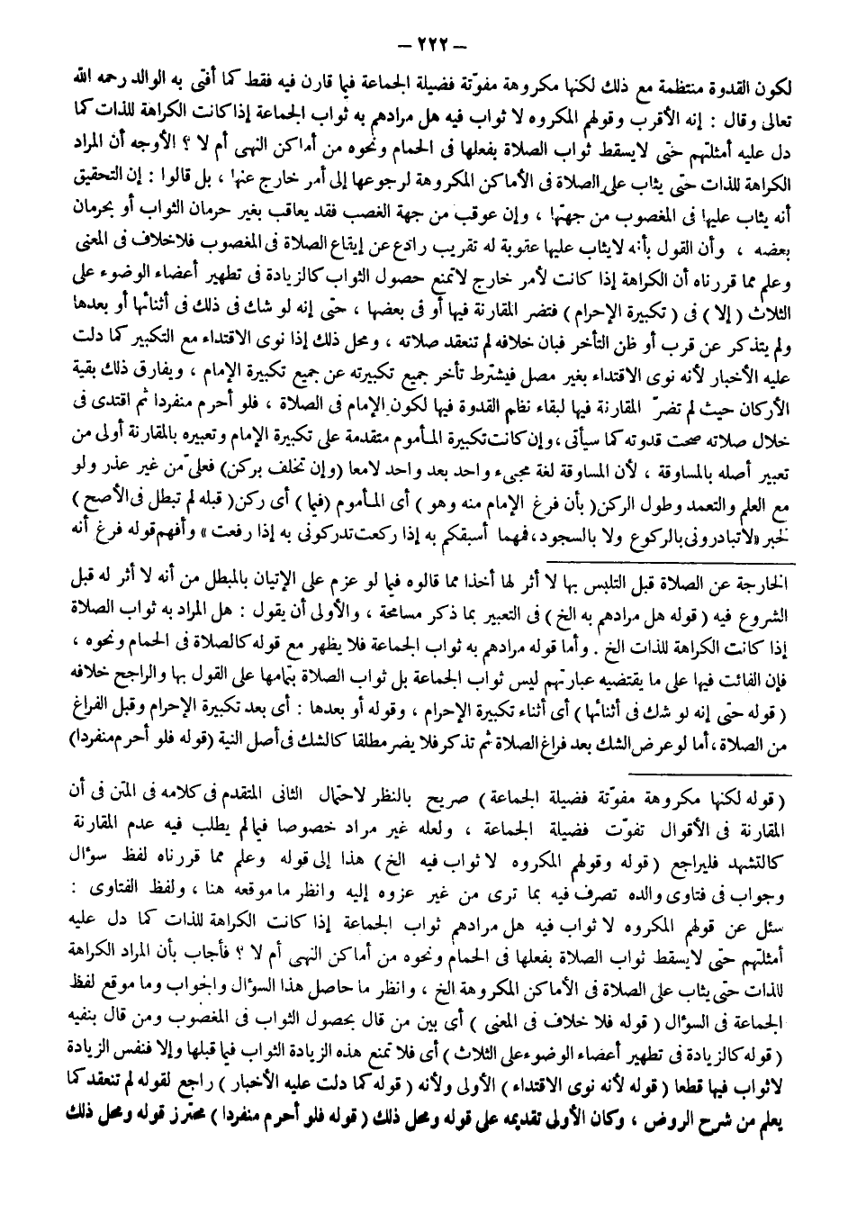 ـــــــــــــــــــــــــــــQقَوْلُهُ: لَكِنَّهَا مَكْرُوهَةٌ مُفَوِّتَةٌ فَضِيلَةَ الْجَمَاعَةِ) صَرِيحٌ بِالنَّظَرِ لِاحْتِمَالِ الثَّانِي الْمُتَقَدِّمِ فِي كَلَامِهِ فِي الْمَتْنِ فِي أَنَّ الْمُقَارَنَةَ فِي الْأَقْوَالِ تُفَوِّتُ فَضِيلَةَ الْجَمَاعَةِ، وَلَعَلَّهُ غَيْرُ مُرَادٍ خُصُوصًا فِيمَا لَمْ يُطْلَبْ فِيهِ عَدَمُ الْمُقَارَنَةِ كَالتَّشَهُّدِ فَلْيُرَاجَعْ (قَوْلُهُ: وَقَوْلُهُمْ الْمَكْرُوهُ لَا ثَوَابَ فِيهِ إلَخْ) هَذَا إلَى قَوْلِهِ وَعُلِمَ مِمَّا قَرَّرْنَاهُ لَفْظُ سُؤَالٍ وَجَوَابٍ فِي فَتَاوَى وَالِدِهِ تَصَرَّفَ فِيهِ بِمَا تَرَى مِنْ غَيْرِ عَزْوِهِ إلَيْهِ وَانْظُرْ مَا مَوْقِعُهُ هُنَا، وَلَفْظُ الْفَتَاوَى: سُئِلَ عَنْ قَوْلِهِمْ الْمَكْرُوهُ لَا ثَوَابَ فِيهِ هَلْ مُرَادُهُمْ ثَوَابُ الْجَمَاعَةِ إذَا كَانَتْ الْكَرَاهَةُ لِلذَّاتِ كَمَا دَلَّ عَلَيْهِ أَمْثِلَتُهُمْ حَتَّى لَا يَسْقُطَ ثَوَابُ الصَّلَاةِ بِفِعْلِهَا فِي الْحَمَّامِ وَنَحْوِهِ مِنْ أَمَاكِنِ النَّهْيِ أَمْ لَا؟ فَأَجَابَ بِأَنَّ الْمُرَادَ الْكَرَاهَةُ لِلذَّاتِ حَتَّى يُثَابَ عَلَى الصَّلَاةِ فِي الْأَمَاكِنِ الْمَكْرُوهَةِ إلَخْ، وَانْظُرْ مَا حَاصِلُ هَذَا السُّؤَالِ وَالْجَوَابِ وَمَا مَوْقِعُ لَفْظِ الْجَمَاعَةِ فِي السُّؤَالِ (قَوْلُهُ: فَلَا خِلَافَ فِي الْمَعْنَى) أَيْ بَيْنَ مَنْ قَالَ بِحُصُولِ الثَّوَابِ فِي الْمَغْصُوبِ وَمَنْ قَالَ بِنَفْيِهِ (قَوْلُهُ: كَالزِّيَادَةِ فِي تَطْهِيرِ أَعْضَاءِ الْوُضُوءِ عَلَى الثَّلَاثِ) أَيْ فَلَا تَمْنَعُ هَذِهِ الزِّيَادَةُ الثَّوَابَ فِيمَا قَبْلَهَا وَإِلَّا فَنَفْسُ الزِّيَادَةِ لَا ثَوَابَ فِيهَا قَطْعًا (قَوْلُهُ:؛ لِأَنَّهُ نَوَى الِاقْتِدَاءَ) الْأَوْلَى وَلِأَنَّهُ (قَوْلُهُ: كَمَا دَلَّتْ عَلَيْهِ الْأَخْبَارُ) رَاجِعٌ لِقَوْلِهِ لَمْ تَنْعَقِدْ كَمَا يُعْلَمْ مِنْ شَرْحِ الرَّوْضِ، وَكَانَ الْأَوْلَى تَقْدِيمَهُ عَلَى قَوْلِهِ وَمَحَلُّ ذَلِكَ.