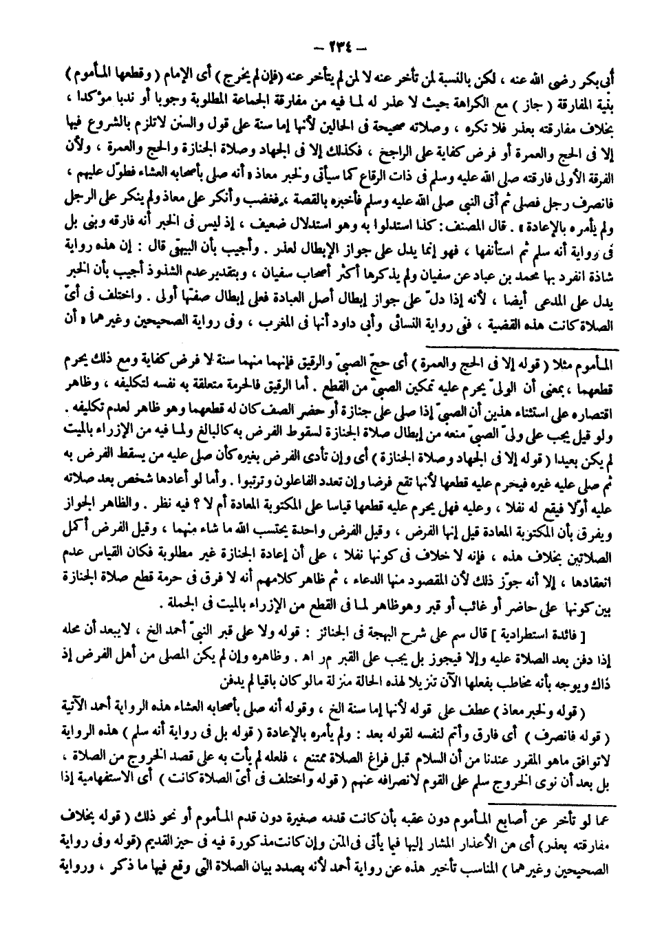 أَبِي بَكْرٍ - رَضِيَ اللَّهُ عَنْهُ -، لَكِنْ بِالنِّسْبَةِ لِمَنْ تَأَخَّرَ عَنْهُ لَا لِمَنْ لَمْ يَتَأَخَّرْ عَنْهُ (فَإِنْ) (لَمْ يَخْرُجْ) أَيْ الْإِمَامُ (وَقَطَعَهَا الْمَأْمُومُ) بِنِيَّةِ الْمُفَارَقَةِ (جَازَ) مَعَ الْكَرَاهَةِ حَيْثُ لَا عُذْرَ لَهُ لِمَا فِيهِ مِنْ مُفَارَقَةِ الْجَمَاعَةِ الْمَطْلُوبَةِ وُجُوبًا أَوْ نَدْبًا مُؤَكَّدًا، بِخِلَافِ مُفَارَقَتِهِ بِعُذْرٍ فَلَا تُكْرَهُ، وَصَلَاتُهُ صَحِيحَةٌ فِي الْحَالَيْنِ؛ لِأَنَّهَا إمَّا سُنَّةٌ عَلَى قَوْلٍ وَالسُّنَنُ لَا تَلْزَمُ بِالشُّرُوعِ فِيهَا إلَّا فِي الْحَجِّ وَالْعُمْرَةِ أَوْ فَرْضُ كِفَايَةٍ عَلَى الرَّاجِحِ، فَكَذَلِكَ إلَّا فِي الْجِهَادِ وَصَلَاةِ الْجِنَازَةِ وَالْحَجِّ وَالْعُمْرَةِ، وَلِأَنَّ الْفِرْقَةَ الْأُولَى فَارَقَتْهُ - صَلَّى اللَّهُ عَلَيْهِ وَسَلَّمَ - فِي ذَاتِ الرِّقَاعِ كَمَا سَيَأْتِي وَلِخَبَرِ مُعَاذٍ «أَنَّهُ صَلَّى بِأَصْحَابِهِ الْعِشَاءَ فَطَوَّلَ عَلَيْهِمْ، فَانْصَرَفَ رَجُلٌ فَصَلَّى ثُمَّ أَتَى النَّبِيَّ - صَلَّى اللَّهُ عَلَيْهِ وَسَلَّمَ - فَأَخْبَرَهُ بِالْقِصَّةِ، فَغَضِبَ وَأَنْكَرَ عَلَى مُعَاذٍ وَلَمْ يُنْكِرْ عَلَى الرَّجُلِ وَلَمْ يَأْمُرْهُ بِالْإِعَادَةِ» . قَالَ الْمُصَنِّفُ: كَذَا اسْتَدَلُّوا بِهِ وَهُوَ اسْتِدْلَالٌ ضَعِيفٌ، إذْ لَيْسَ فِي الْخَبَرِ أَنَّهُ فَارَقَهُ وَبَنَى بَلْ فِي رِوَايَةٍ أَنَّهُ سَلَّمَ ثُمَّ اسْتَأْنَفَهَا، فَهُوَ إنَّمَا يَدُلُّ عَلَى جَوَازِ الْإِبْطَالِ لِعُذْرٍ. وَأُجِيبَ بِأَنَّ الْبَيْهَقِيَّ قَالَ: إنَّ هَذِهِ رِوَايَةٌ شَاذَّةٌ انْفَرَدَ بِهَا مُحَمَّدُ بْنُ عَبَّادٍ عَنْ سُفْيَانَ وَلَمْ يَذْكُرْهَا أَكْثَرُ أَصْحَابِ سُفْيَانَ، وَبِتَقْدِيرِ عَدَمِ الشُّذُوذِ أُجِيبَ بِأَنَّ الْخَبَرَ يَدُلُّ عَلَى الْمُدَّعَى أَيْضًا؛ لِأَنَّهُ إذَا دَلَّ عَلَى جَوَازِ إبْطَالِ أَصْلِ الْعِبَادَةِ فَعَلَى إبْطَالِ صِفَتِهَا أَوْلَى.