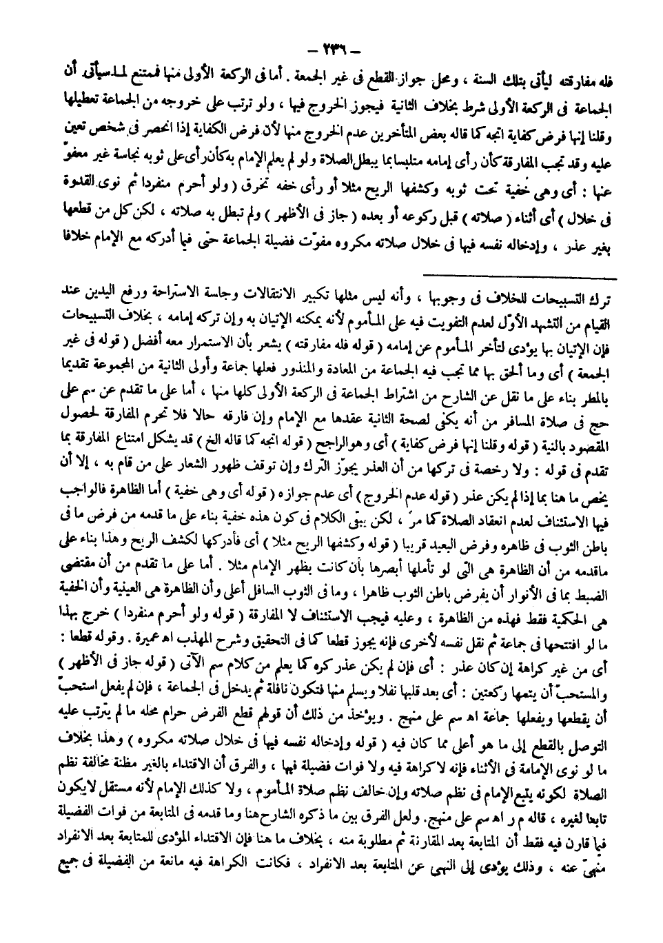 وَمَحَلُّ جَوَازِ الْقَطْعِ فِي غَيْرِ الْجُمُعَةِ. أَمَّا فِي الرَّكْعَةِ الْأُولَى مِنْهَا فَمُمْتَنِعٌ لِمَا سَيَأْتِي أَنَّ الْجَمَاعَةَ فِي الرَّكْعَةِ الْأُولَى شَرْطٌ بِخِلَافِ الثَّانِيَةِ فَيَجُوزُ الْخُرُوجُ فِيهَا، وَلَوْ تَرَتَّبَ عَلَى خُرُوجِهِ مِنْ الْجَمَاعَةِ تَعْطِيلُهَا وَقُلْنَا إنَّهَا فَرْضُ كِفَايَةٍ اتَّجَهَ كَمَا قَالَهُ بَعْضُ الْمُتَأَخِّرِينَ عَدَمُ الْخُرُوجِ مِنْهَا؛ لِأَنَّ فَرْضَ الْكِفَايَةِ إذَا انْحَصَرَ فِي شَخْصٍ تَعَيَّنَ عَلَيْهِ وَقَدْ تَجِبُ الْمُفَارَقَةُ كَأَنْ رَأَى إمَامَهُ مُتَلَبِّسًا بِمَا يُبْطِلُ الصَّلَاةَ وَلَوْ لَمْ يَعْلَمْ الْإِمَامُ بِهِ كَأَنْ رَأَى عَلَى ثَوْبِهِ نَجَاسَةً غَيْرَ مَعْفُوٍّ عَنْهَا: أَيْ وَهِيَ خَفِيَّةٌ تَحْتَ ثَوْبِهِ وَكَشَفَهَا الرِّيحُ مَثَلًا أَوْ رَأَى خُفَّهُ تُخْرَقُ.