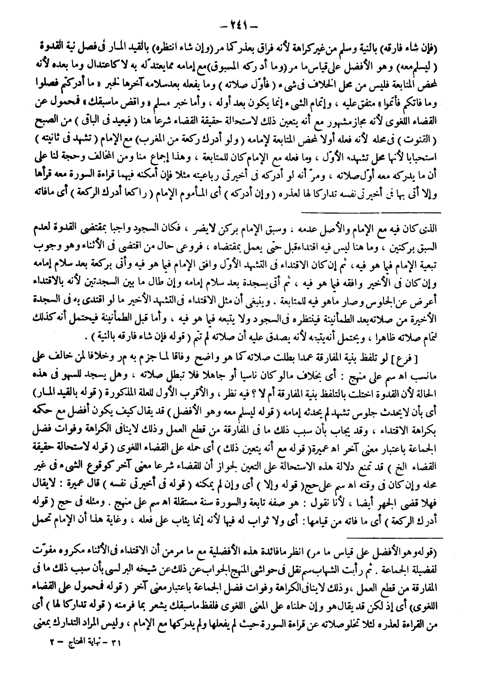 ـــــــــــــــــــــــــــــSالَّذِي كَانَ فِيهِ مَعَ الْإِمَامِ وَالْأَصْلُ عَدَمُهُ، وَسَبْقُ الْإِمَامِ بِرُكْنٍ لَا يَضُرُّ، فَكَانَ السُّجُودُ وَاجِبًا بِمُقْتَضَى الْقُدْوَةِ لِعَدَمِ السَّبْقِ بِرُكْنَيْنِ، وَمَا هُنَا لَيْسَ فِيهِ اقْتِدَاءٌ قَبْلُ حَتَّى يَعْمَلَ بِمُقْتَضَاهُ، فَرُوعِيَ حَالُ مَنْ اقْتَضَى فِي الْأَثْنَاءِ وَهُوَ وُجُوبُ تَبَعِيَّةِ الْإِمَامِ فِيمَا هُوَ فِيهِ، ثُمَّ إنْ كَانَ الِاقْتِدَاءُ فِي التَّشَهُّدِ الْأَوَّلِ وَافَقَ الْإِمَامَ فِيمَا هُوَ فِيهِ وَأَتَى بِرَكْعَةٍ بَعْدَ سَلَامِ إمَامِهِ وَإِنْ كَانَ فِي الْأَخِيرِ وَافَقَهُ فِيمَا هُوَ فِيهِ، ثُمَّ أَتَى بِسَجْدَةٍ بَعْدَ سَلَامِ إمَامِهِ وَإِنْ طَالَ مَا بَيْنَ السَّجْدَتَيْنِ؛ لِأَنَّهُ بِالِاقْتِدَاءِ أَعْرَضَ عَنْ الْجُلُوسِ وَصَارَ مَا هُوَ فِيهِ لِلْمُتَابَعَةِ، وَيَنْبَغِي أَنَّ مِثْلَ الِاقْتِدَاءِ فِي التَّشَهُّدِ الْأَخِيرِ مَا لَوْ اقْتَدَى بِهِ فِي السَّجْدَةِ الْأَخِيرَةِ مِنْ صَلَاتِهِ بَعْدَ الطُّمَأْنِينَةِ فَيَنْتَظِرُهُ فِي السُّجُودِ وَلَا يَتْبَعُهُ فِيمَا هُوَ فِيهِ، وَأَمَّا قَبْلَ الطُّمَأْنِينَةِ فَيُحْتَمَلُ أَنَّهُ كَذَلِكَ لِتَمَامِ صَلَاتِهِ ظَاهِرًا، وَيُحْتَمَلُ أَنَّهُ يَتْبَعُهُ؛ لِأَنَّهُ يَصْدُقُ عَلَيْهِ أَنَّ صَلَاتَهُ لَمْ تَتِمَّ.