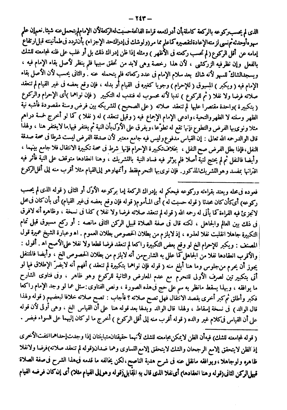 نَعَمْ إنْ عَلِمَ سَهْوَهُ أَوْ حَدَثَهُ ثُمَّ نَسِيَ لَزِمَتْهُ الْإِعَادَةُ لِتَقْصِيرِهِ كَمَا عُلِمَ مِمَّا مَرَّ (وَلَوْ) (شَكَّ فِي إدْرَاكِ حَدِّ الْإِجْزَاءِ) بِأَنْ تَرَدَّدَ فِي طُمَأْنِينَتِهِ قَبْلَ ارْتِفَاعِ إمَامِهِ عَنْ أَقَلِّ الرُّكُوعِ (لَمْ تُحْسَبْ رَكْعَتُهُ فِي الْأَظْهَرِ) وَمِثْلُهُ إذَا ظَنَّ إدْرَاكَ ذَلِكَ بَلْ أَوْ غَلَبَ عَلَى ظَنِّهِ لِمُجَامَعَتِهِ لِلشَّكِّ بِالْفِعْلِ وَإِنْ نَظَرَ فِيهِ الزَّرْكَشِيُّ؛ لِأَنَّ هَذَا رُخْصَةٌ وَهِيَ لَا بُدَّ مِنْ تَحَقُّقِ سَبَبِهَا فَلَمْ يُنْظَرْ لِأَصْلِ بَقَاءِ الْإِمَامِ فِيهِ، وَيَسْجُدُ الشَّاكُّ لِلسَّهْوِ؛ لِأَنَّهُ شَاكٌّ بَعْدَ سَلَامِ الْإِمَامِ فِي عَدَدِ رَكَعَاتِهِ فَلَمْ يَتَحَمَّلْهُ عَنْهُ. وَالثَّانِي يُحْسَبُ؛ لِأَنَّ الْأَصْلَ بَقَاءُ الْإِمَامِ فِيهِ.