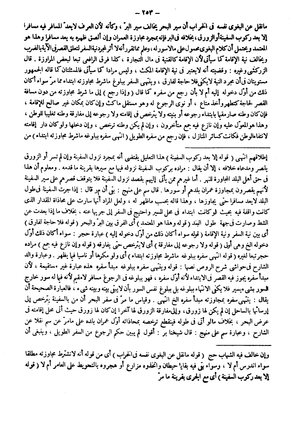 مَا نَقَلَهُ عَنْ الْبَغَوِيّ نَفْسِهِ فِي الْخَرَابِ أَنَّ سَيْرَ الْبَحْرِ يُخَالِفُ سَيْرَ الْبَرِّ، وَكَأَنَّهُ لِأَنَّ الْعُرْفَ لَا يَعُدُّ الْمُسَافِرَ فِيهِ مُسَافِرًا إلَّا بَعْدَ رُكُوبِ السَّفِينَةِ أَوْ الزَّوْرَقِ، بِخِلَافِهِ فِي الْبَرِّ فَإِنَّهُ بِمُجَرَّدِ مُجَاوَزَةِ الْعُمْرَانِ وَإِنْ أَلْصَقَ ظَهْرَهُ بِهِ يُعَدُّ مُسَافِرًا وَهَذَا هُوَ الْمُعْتَمَدُ وَيَحْتَمِلُ أَنَّ كَلَامَ الْبَغَوِيّ مَحْمُولٌ عَلَى مَا لَا سُورَ لَهُ، وَعُلِمَ مِمَّا تَقَرَّرَ أَنَّهُ لَا أَثَرَ لِمُجَرَّدِ نِيَّةِ السَّفَرِ لِتَعَلُّقِ الْقَصْرِ فِي الْآيَةِ بِالضَّرْبِ وَيُخَالِفُ نِيَّةَ الْإِقَامَةِ كَمَا سَيَأْتِي؛ لِأَنَّ الْإِقَامَةَ كَالْقُنْيَةِ فِي مَالِ التِّجَارَةِ، كَذَا فَرَّقَ الرَّافِعِيُّ تَبَعًا لِبَعْضِ الْمَرَاوِزَةِ. قَالَ الزَّرْكَشِيُّ وَغَيْرُهُ: وَقَضِيَّتُهُ أَنَّهُ لَا يُعْتَبَرُ فِي نِيَّةِ الْإِقَامَةِ الْمُكْثُ، وَلَيْسَ مُرَادًا كَمَا سَيَأْتِي فَالْمَسْأَلَتَانِ كَمَا قَالَهُ الْجُمْهُورُ مُسْتَوِيَتَانِ فِي أَنَّ مُجَرَّدَ النِّيَّةِ لَا يَكْفِي فَلَا حَاجَةَ لِفَارِقٍ، وَيَنْتَهِي السَّفَرُ بِبُلُوغِ مَا شُرِطَ مُجَاوَزَتُهُ ابْتِدَاءً مِمَّا مَرَّ سَوَاءٌ أَكَانَ ذَلِكَ مِنْ أَوَّلِ دُخُولِهِ إلَيْهِ أَمْ لَا بِأَنْ رَجَعَ مِنْ سَفَرِهِ كَمَا قَالَ.
