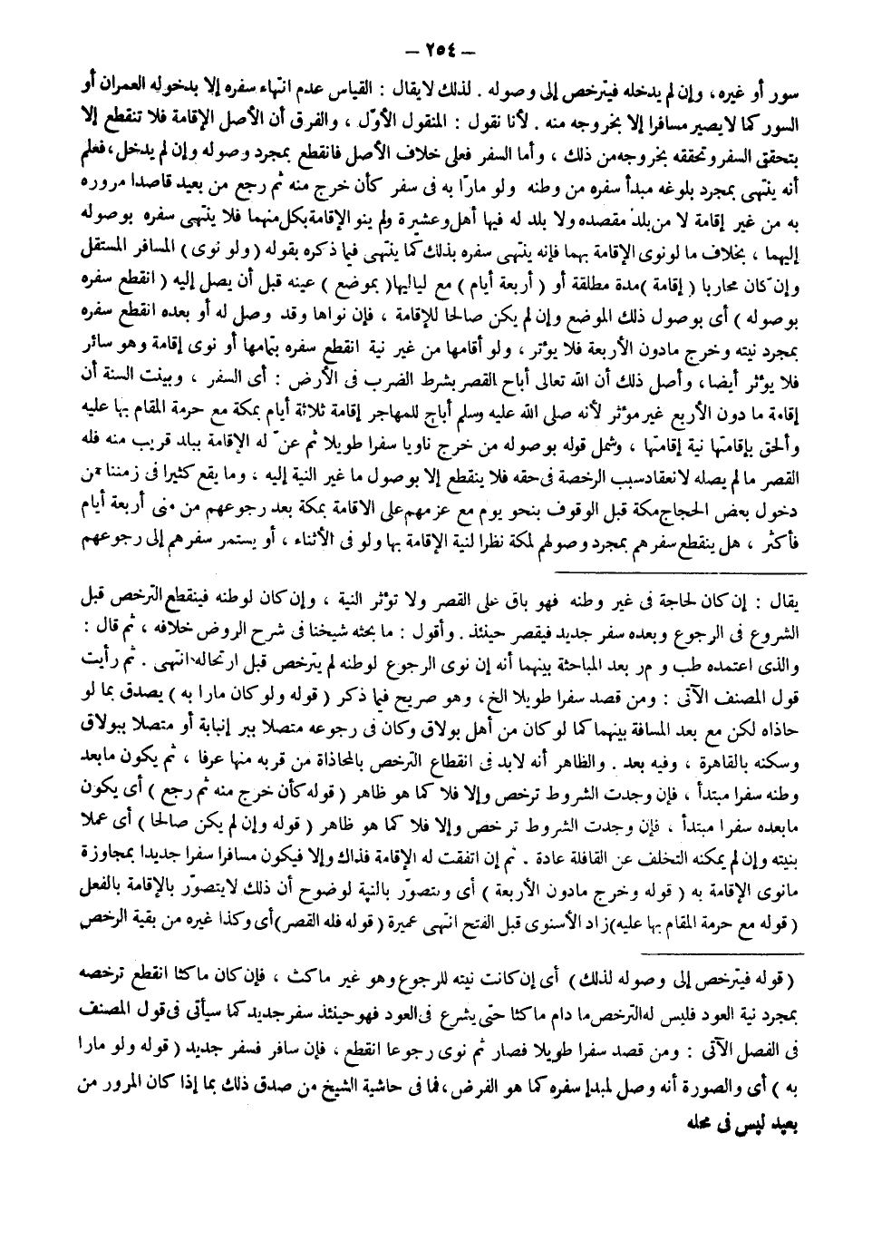 سُورٍ أَوْ غَيْرِهِ، وَإِنْ لَمْ يَدْخُلْهُ فَيَتَرَخَّصُ إلَى وُصُولِهِ. لِذَلِكَ لَا يُقَالُ: الْقِيَاسُ عَدَمُ انْتِهَاءِ سَفَرِهِ إلَّا بِدُخُولِهِ الْعُمْرَانَ أَوْ السُّورَ كَمَا لَا يَصِيرُ مُسَافِرًا إلَّا بِخُرُوجِهِ مِنْهُ؛ لِأَنَّا نَقُولُ: الْمَنْقُولُ الْأَوَّلُ، وَالْفَرْقُ أَنَّ الْأَصْلَ الْإِقَامَةُ فَلَا تَنْقَطِعُ إلَّا بِتَحَقُّقِ السَّفَرِ وَتَحَقُّقُهُ بِخُرُوجِهِ مِنْ ذَلِكَ، وَأَمَّا السَّفَرُ فَعَلَى خِلَافِ الْأَصْلِ فَانْقَطَعَ بِمُجَرَّدِ وُصُولِهِ وَإِنْ لَمْ يَدْخُلْ، فَعُلِمَ أَنَّهُ يَنْتَهِي بِمُجَرَّدِ بُلُوغِهِ مَبْدَأَ سَفَرِهِ مِنْ وَطَنِهِ وَلَوْ مَارًّا بِهِ فِي سَفَرٍ كَأَنْ خَرَجَ مِنْهُ ثُمَّ رَجَعَ مِنْ بَعِيدٍ قَاصِدًا مُرُورَهُ بِهِ مِنْ غَيْرِ إقَامَةٍ لَا مِنْ بَلَدِ مَقْصِدِهِ وَلَا بَلَدَ لَهُ فِيهَا أَهْلٌ وَعَشِيرَةٌ وَلَمْ يَنْوِ الْإِقَامَةَ بِكُلٍّ مِنْهُمَا فَلَا يَنْتَهِي سَفَرُهُ بِوُصُولِهِ إلَيْهِمَا، بِخِلَافِ مَا لَوْ نَوَى الْإِقَامَةَ بِهِمَا فَإِنَّهُ يَنْتَهِي سَفَرُهُ بِذَلِكَ كَمَا يَنْتَهِي فِيمَا ذَكَرَهُ بِقَوْلِهِ